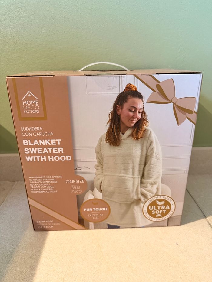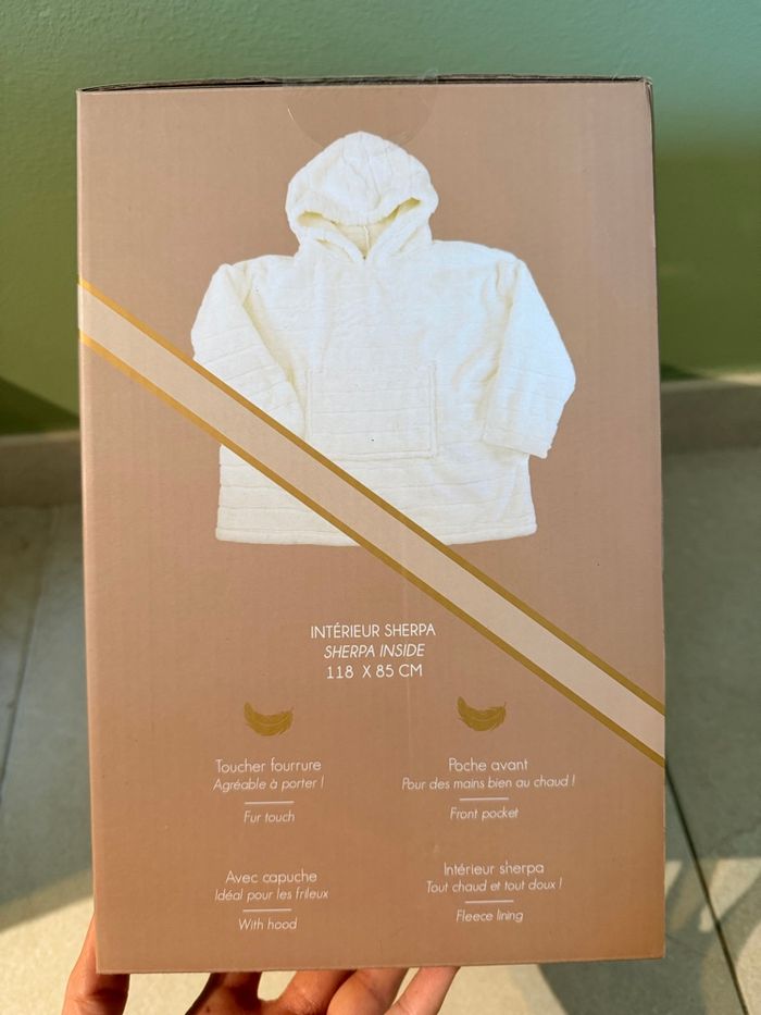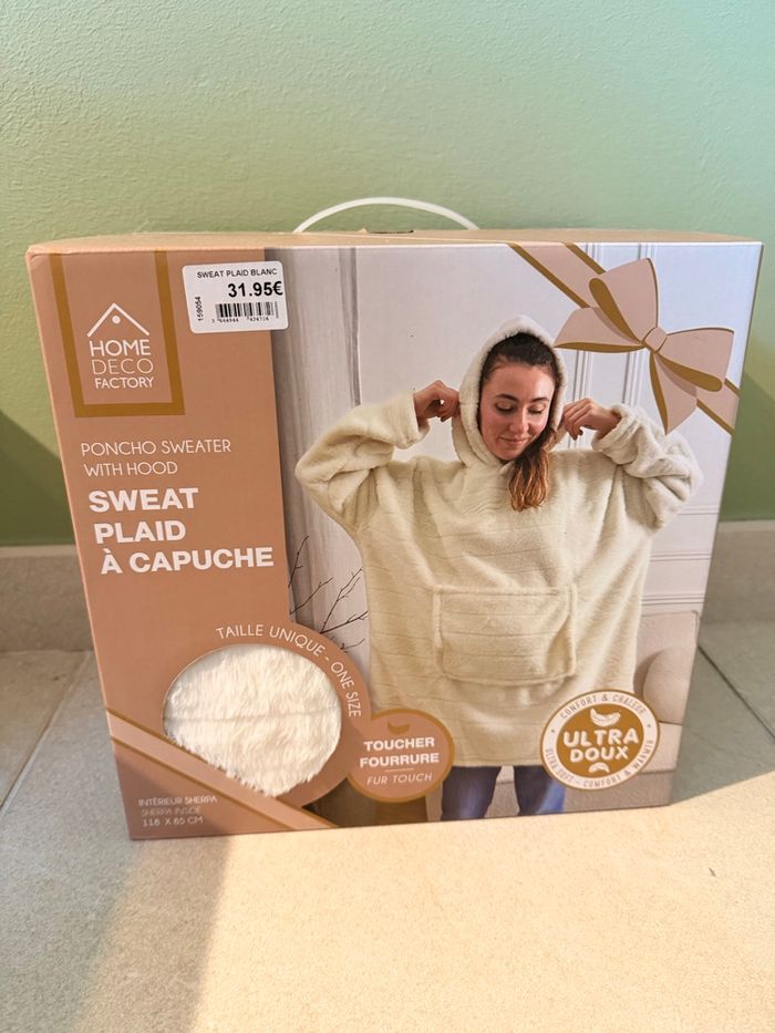 Offrez-vous un cocon de douceur avec ce sweat plaid à capuche de la marque Home Deco Factory. Parfait pour les soirées cocooning ou les journées fraîches à la maison, ce modèle ultra doux au toucher fourrure vous enveloppe de chaleur grâce à sa doublure intérieure en Sherpa. • Taille unique : convient à tous • Dimensions : 118 x 85 cm • Capuche intégrée : idéale pour les frileux • Poche ventrale pratique pour garder les mains au chaud • Couleur : blanc crème • Neuf, jamais utilisé, encore dans son emballage d’origine • Excellent choix cadeau ! Envoi rapide et protégé. D’autres photos sur demande. #plaid #sweatcapuche #cocooning #homewear #vêtementchaud #hiver #sherpa #ultrasoft #sweatplaid