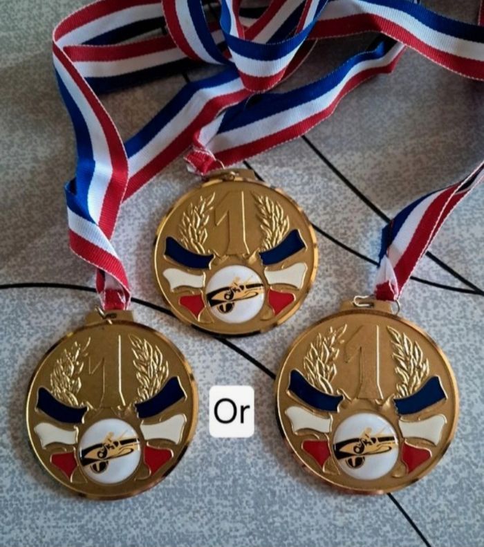 Lot médailles sportives. On peut retirer les autocollants et en mettre d'autres par rapport au sport recherché. Voir détails sur les photos. 5€ les 5 médailles ou 3€ les 3.