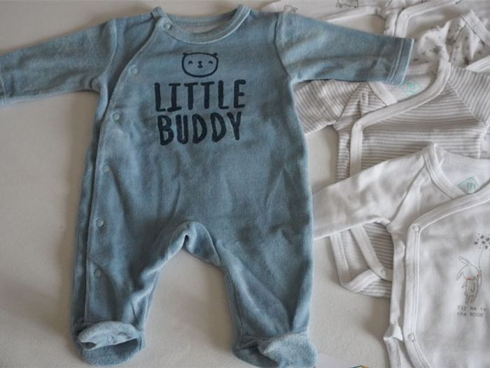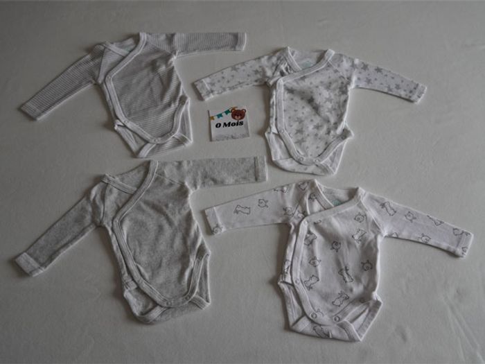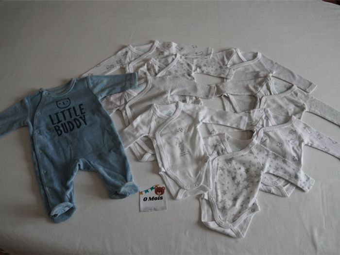 Articles restés en excellent état, sans tâches. Il y a 1 Pyjama velours bleu fantaisie + 8 bodies ML blancs/gris fantaisies (Petits lapins, rayures, étoiles...)