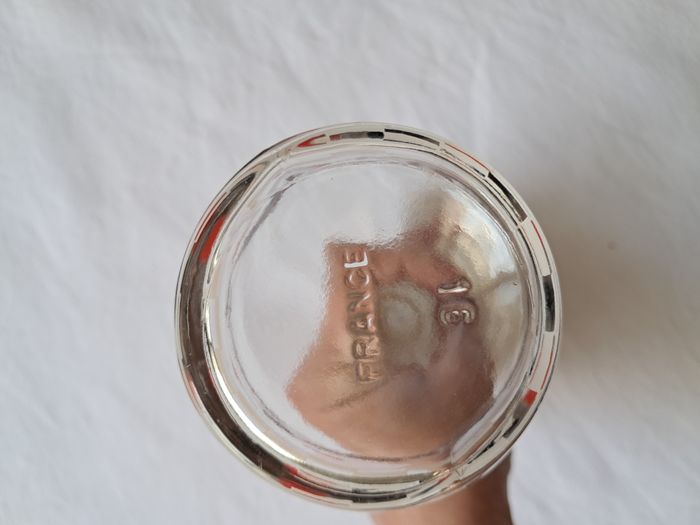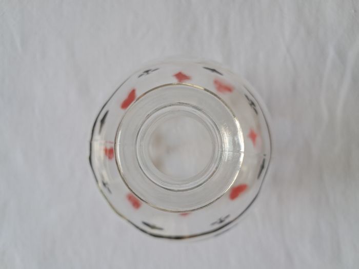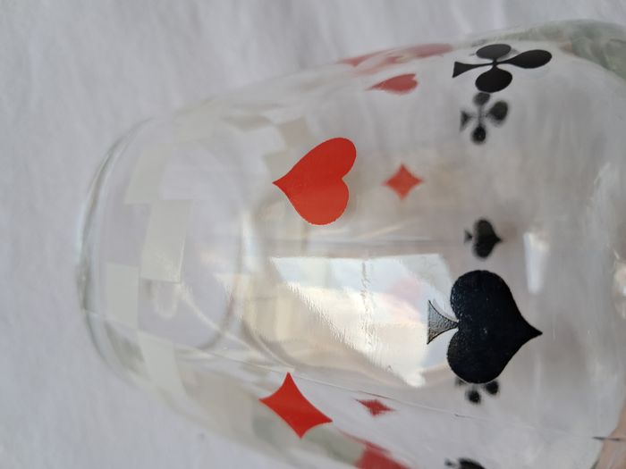 Carafe en verre transparent 45 cl Motif carte à jouer trèfle, pique, cœur, carreau rouge et noir Damier blanc Vintage, ancien Hauteur sans bouchon : 15,5 cm Hauteur avec bouchon : 22 cm Diamètre du col : 2 cm Poids : 325 grammes Le verre est bien brillant mais il a des traces de stockage voir photos Les motifs sont intacts Le bouchon n'est pas d'origine Bon état
