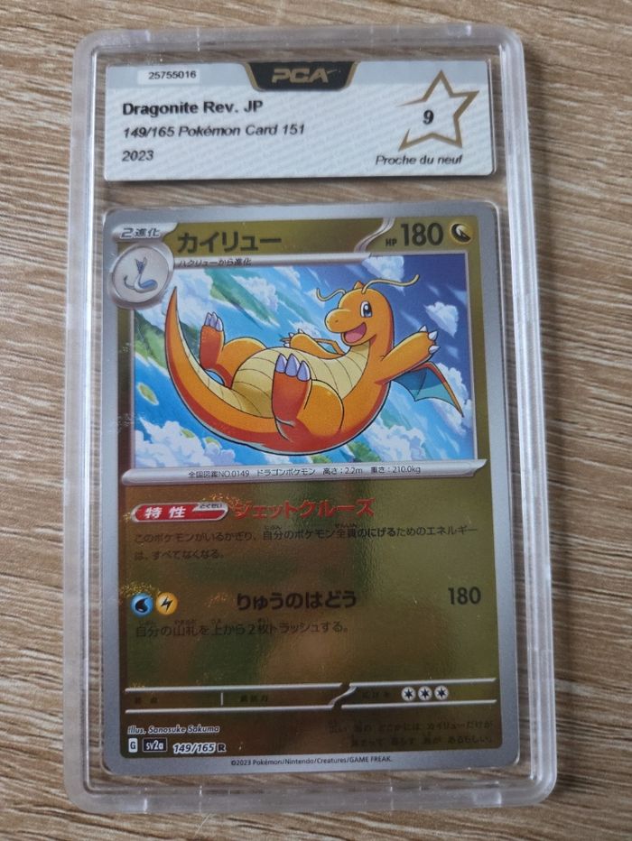 Je vends cette carte Pokémon japonaise Dragonite Rev. JP, de la série 149/165, en édition 2023. - Type de produit : Carte de jeu de cartes à collectionner - Personnage : Dragonite - Série : 149/165 - Édition : 2023 - Langue : Japonais - Certification : PCA