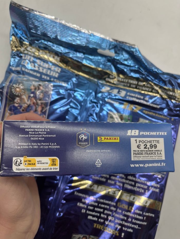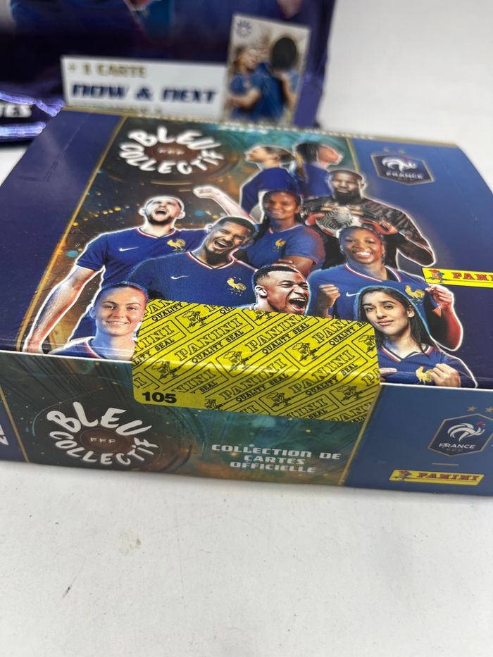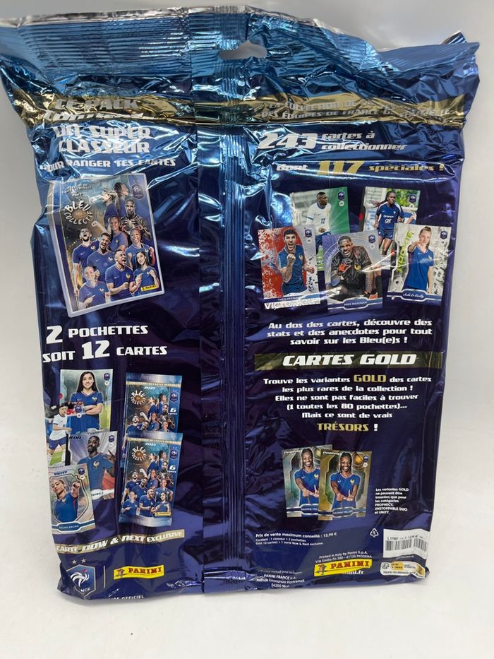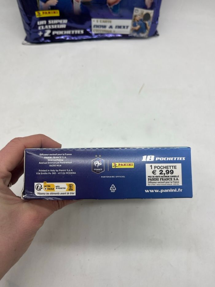 Kit de démarrage avec boite de carte Foot Panini Bleu collectif Neuf Le lot n'est pas dissociable !! Dans la boite vous avez 18 pochettes de cartes l'album est également neuf