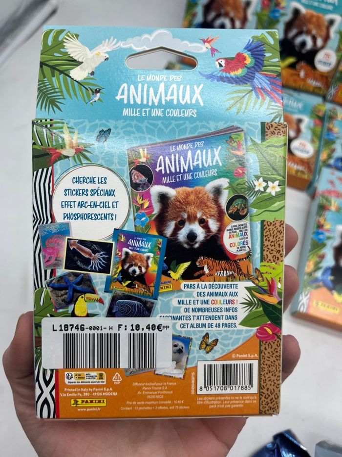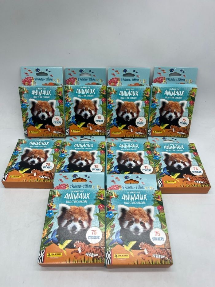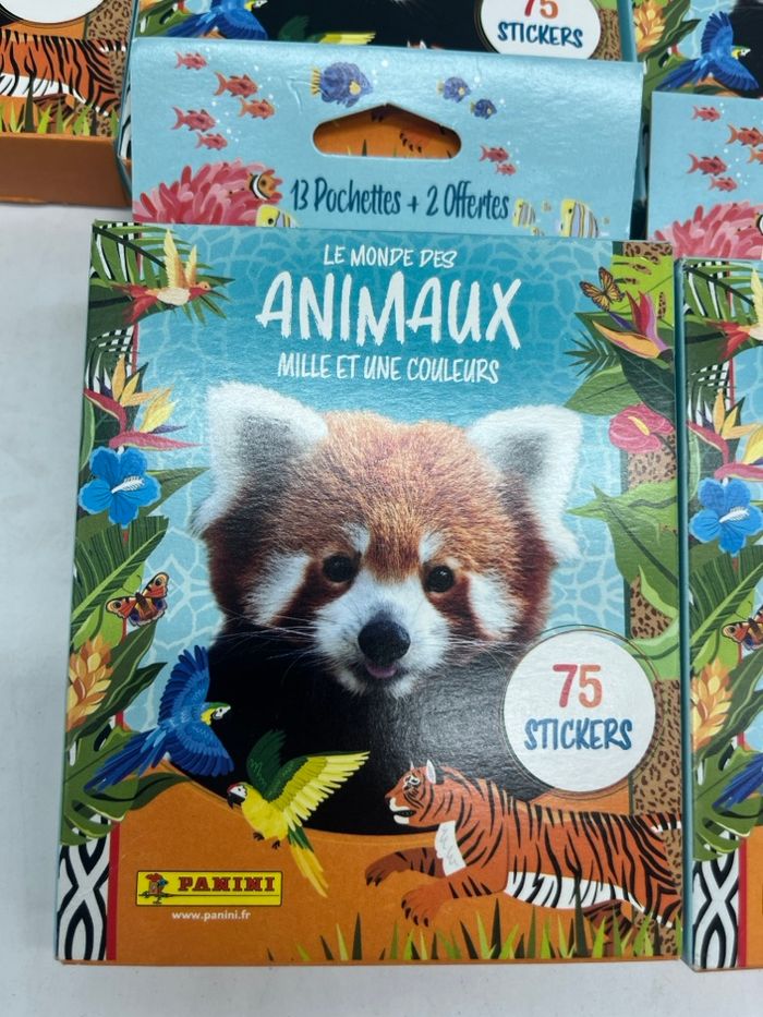 Lot de 10 paquets Panini de 15 pochettes Chacun Le Monde des animaux Neuf Dans chaque paquet il y a 15 pochettes de chaque 5 stickers. Neuf jamais ouvert valeur 100€