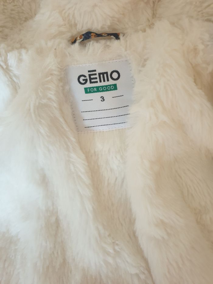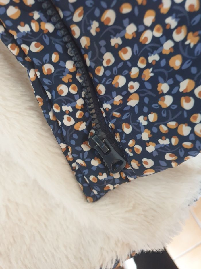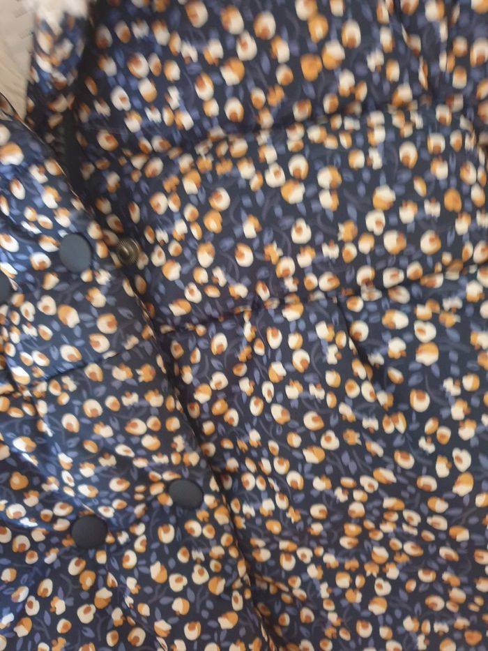En très bon état, pas trouvé. Bleu marine avec motifs. Doudoune blanche à l'intérieur. Fermeture éclair et boutons pression. Marque gémo