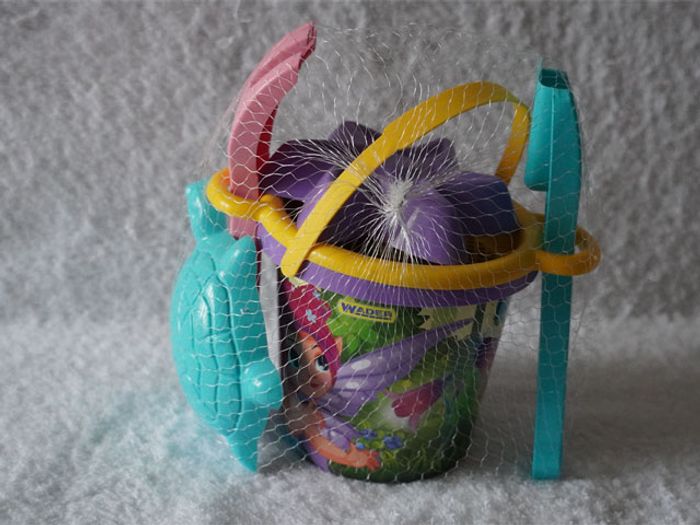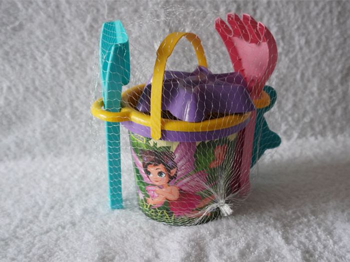 Articles neufs encore sous filet. Il y a 1 seau fantaisie, 1 tamis, 1 pelle, 1 râteau, 2 moules.