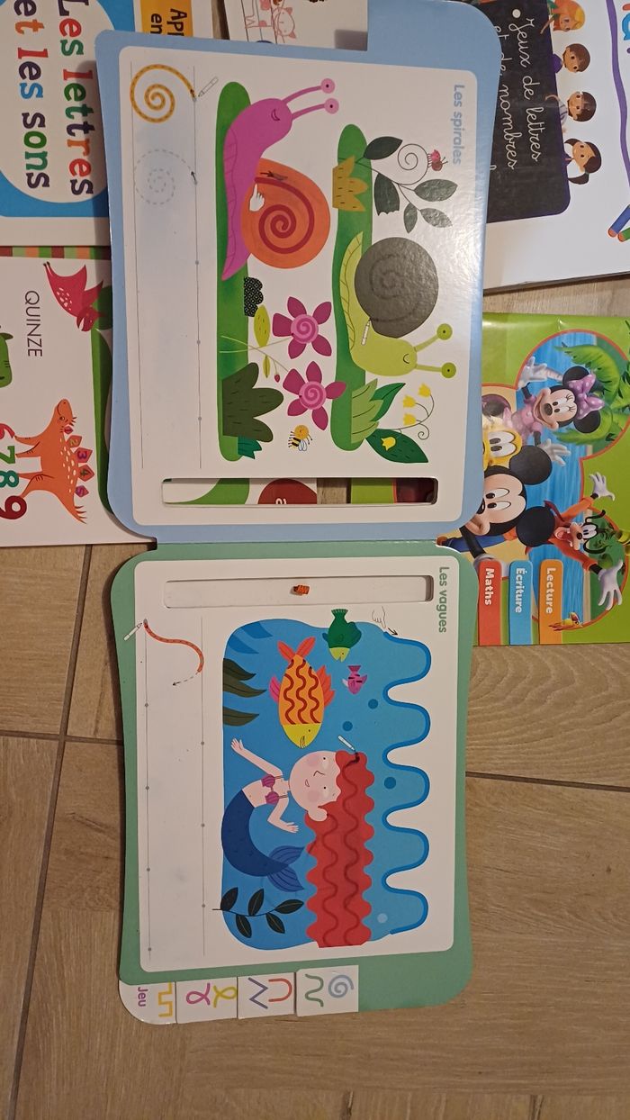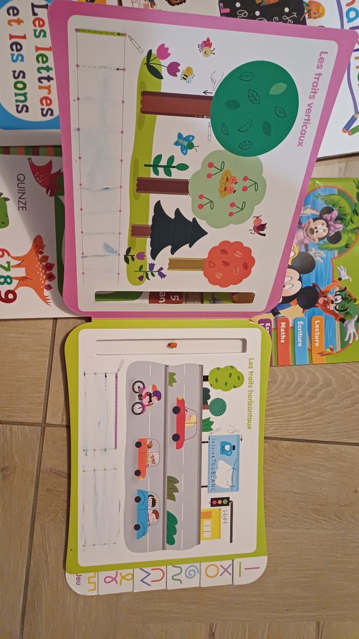 Lot de cahiers niveaux maternelle 2 cahiers de vacances MS vers GS et GS vers CP Nombres Lettres et sons Coloriage Et cahier ardoise pour graphisme ( voir photos quelques traces de weleda persistent) Les cahiers sont en bons états env 10 pages faites sur 2 cahiers ( coloriage camion et le livre des nombres). Les autres n ont pas été écrit