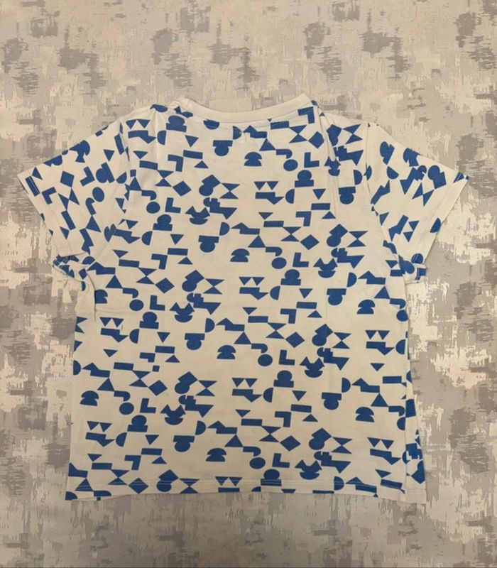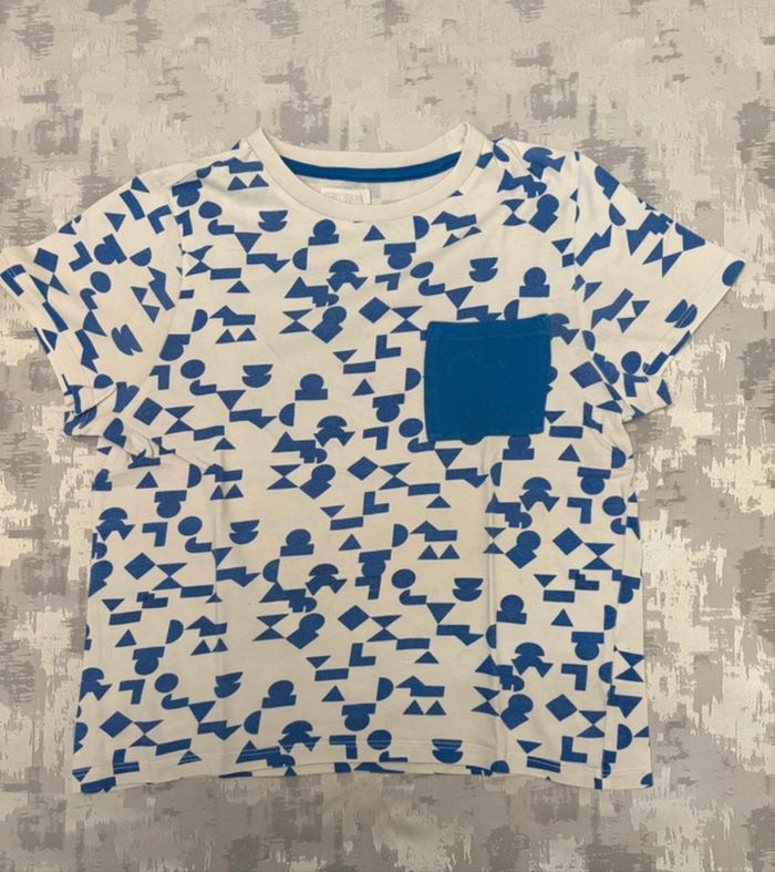 👕 Tee-shirt garçon manches courtes Storytelling blanc à motifs bleus – 10 ans – TBE