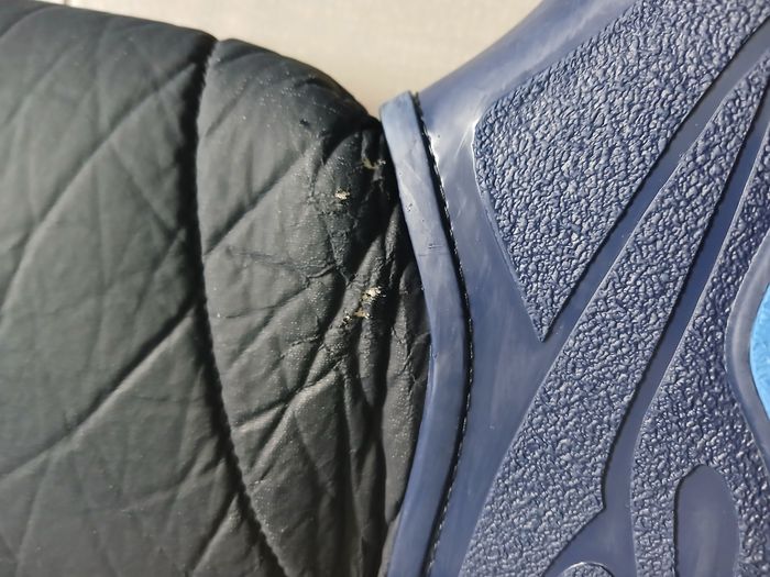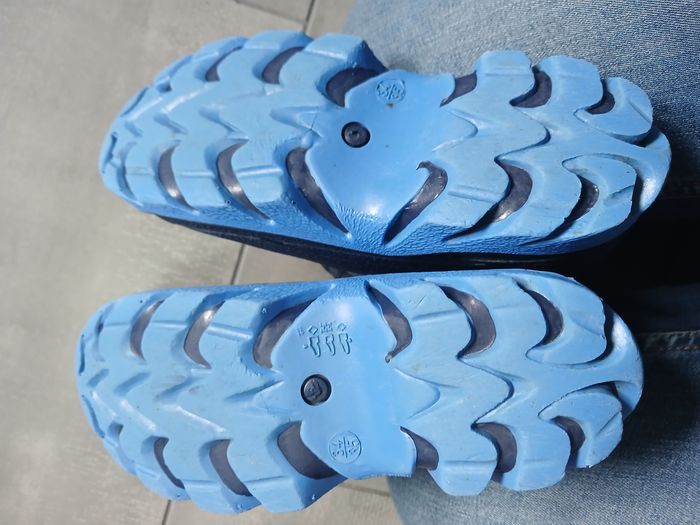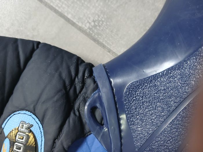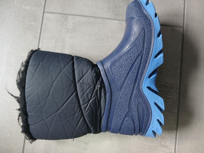 Bottes marines et bleues fourrées, très chaudes. En bon état (quelques accrocs au dessus de la chaussure : voir photo) Fermeture par scratch. Taille 34 / 35.