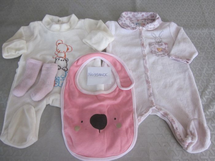 naissance, 2 pyjamas dont un neuf + bavoir + paire de cho7 offerte, cie des petits, snow elf
