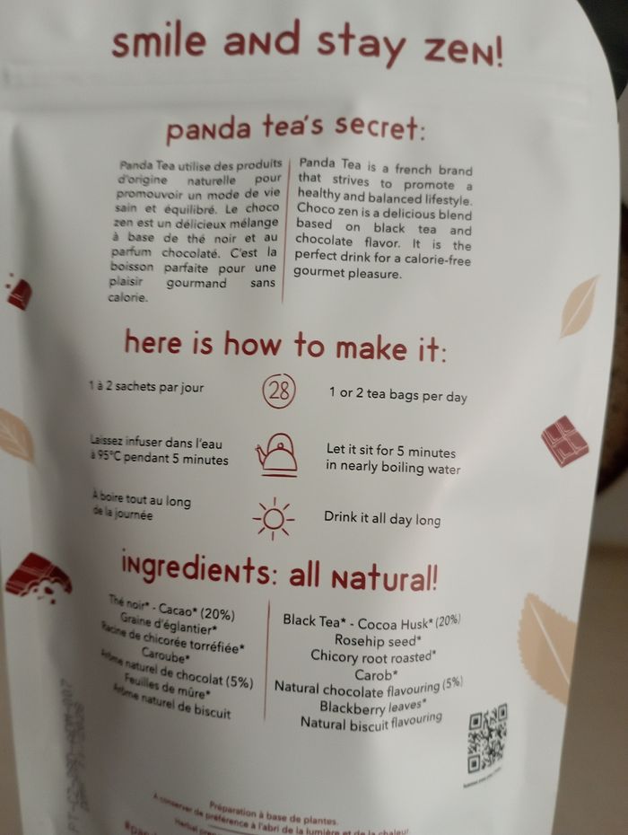 Panda Tea Paquet neuf refermable de 28 sachets Parfum chocolat Thé noir 11/2028 Valeur neuf 15.99