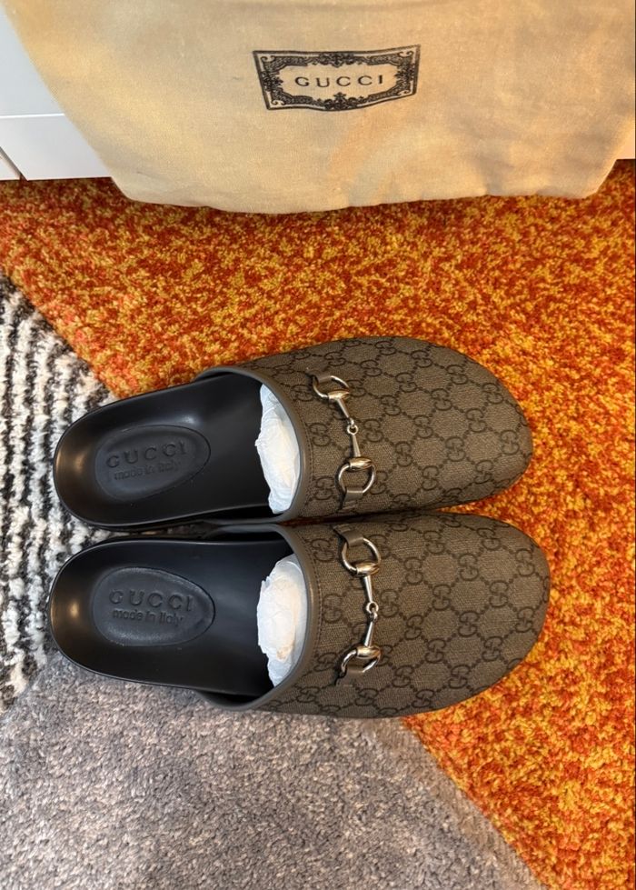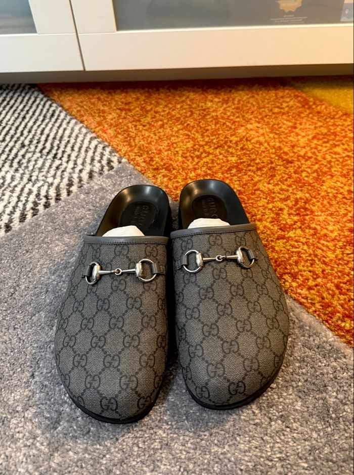 Mules Gucci Princetown iconiques en toile monogrammée GG noir/gris avec détail mors doré. Intérieur en cuir noir, fabrication made in Italy. Modèle chic et intemporel, confortable et facile à porter. Bon état général (voir photos). Vendues avec housse Gucci.