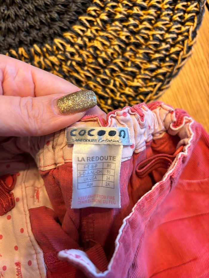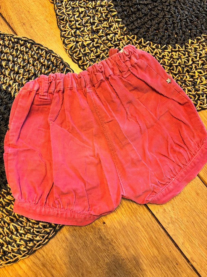 Jolie short la redoute, taille 86 cm très bon état, hormis une légère marque d’épingle 100% coton réglable à la taille