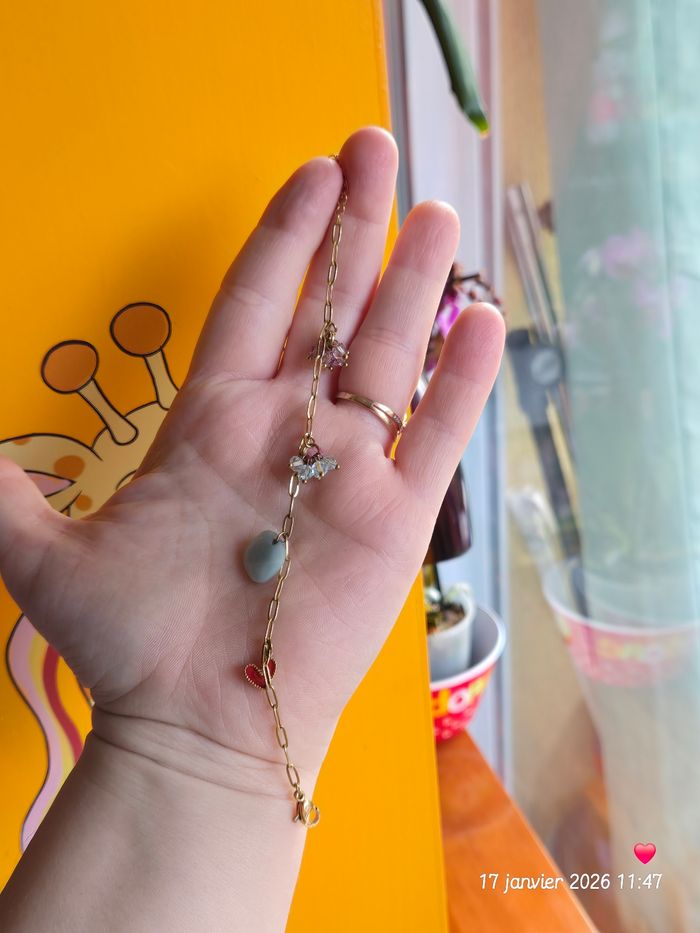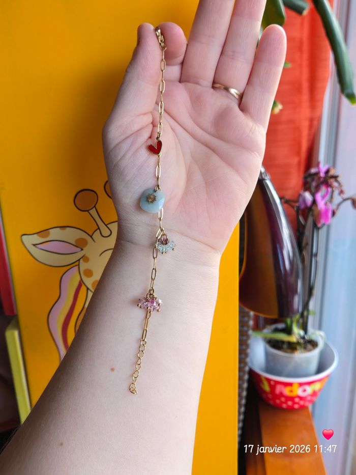 ✨ Bracelet en acier inoxydable – Thème naissance fille/garçon J'ai également mis en vente le collier assorti sur le même thème. Très joli bracelet en acier inoxydable, porté une seule fois. Il est décoré de charms sur le thème de la naissance, avec des touches bleues et roses représentant à la fois fille et garçon. Charms présents : - cœur rouge, - médaillon bleu motif soleil doré, - fleurs ornées de pierres roses et bleues. État impeccable, aucun défaut. Bijou symbolique, idéal comme cadeau de naissance ou pour une future maman. 📍 Remise en main propre entre Torcy et Lognes 77. 💶 Prix : 20€