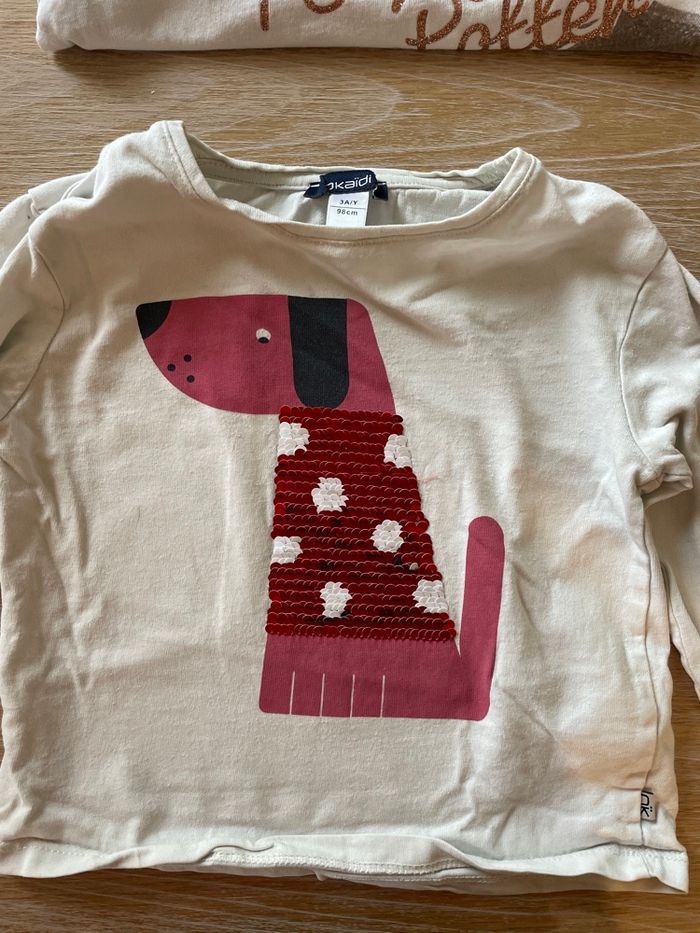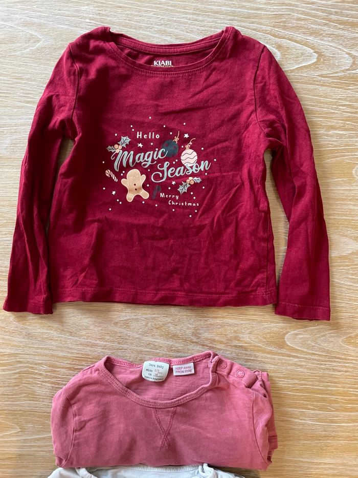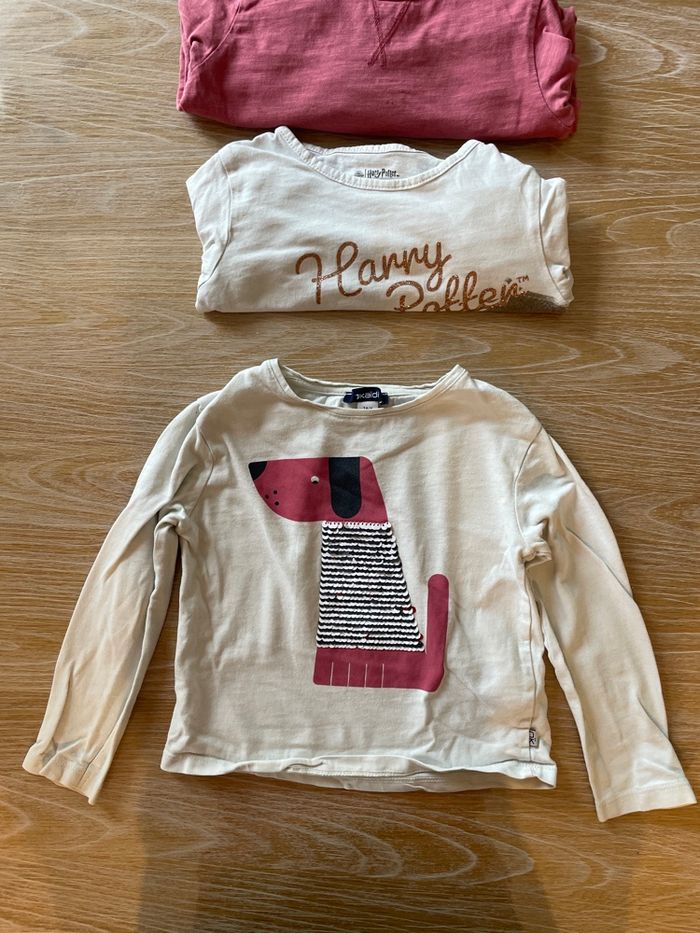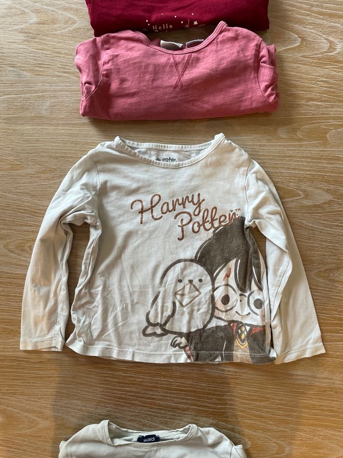 Lot de 4 hauts à manches longues fin, idéal sous-pull Kiabi —> thème Noël Zara —> haut présentant minis trous voir photo Haut —> Harry Potter présentant une tache au niveau du col voir photo. Okaïdi —> haut à sequins