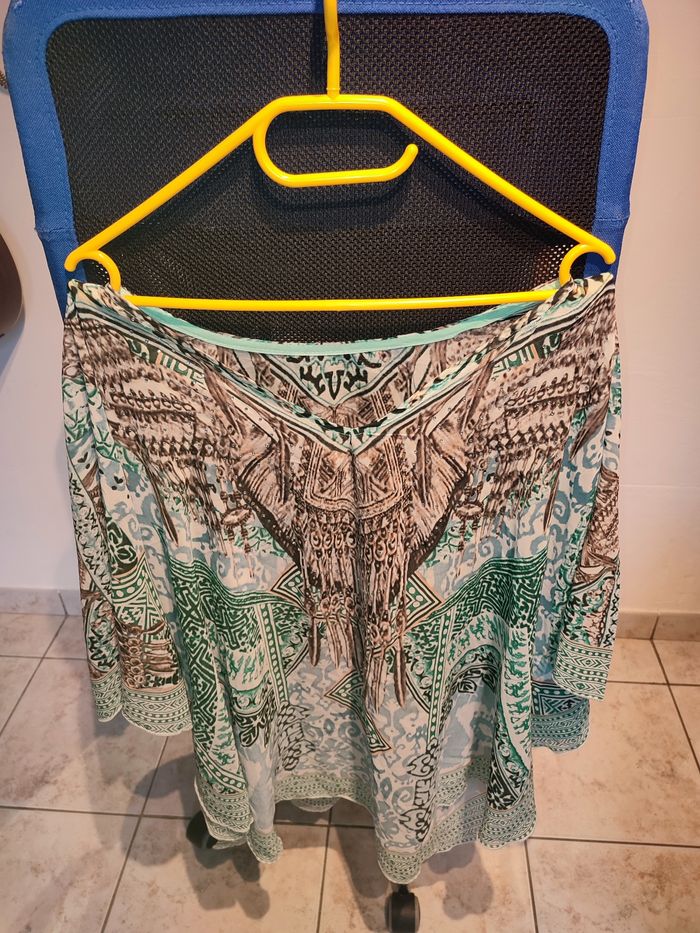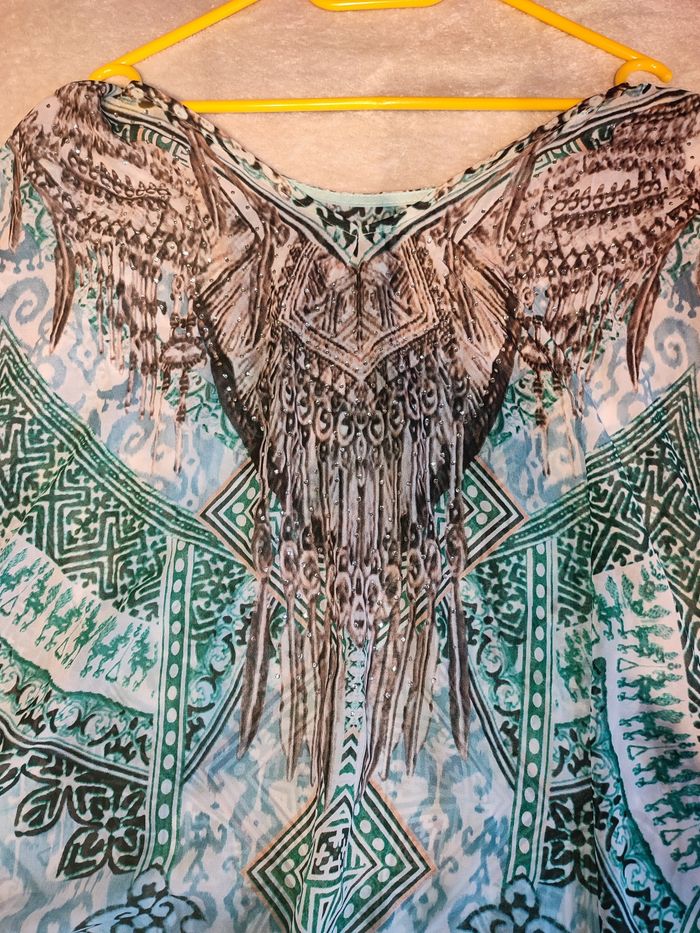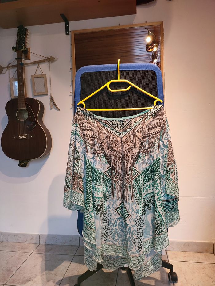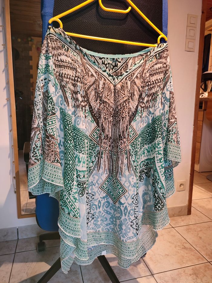 Top chauve souris Je vends j'ce magnifique top chauve souris. Taille 48/50. Complément neuf jamais porté ✨ Légèrement transparent Couleurs turquoise, marron, blanc, noir et strass Largeur aisselle à aisselle à plat: 70cm Longueur 87cm 10€ Envoi rapide 📦