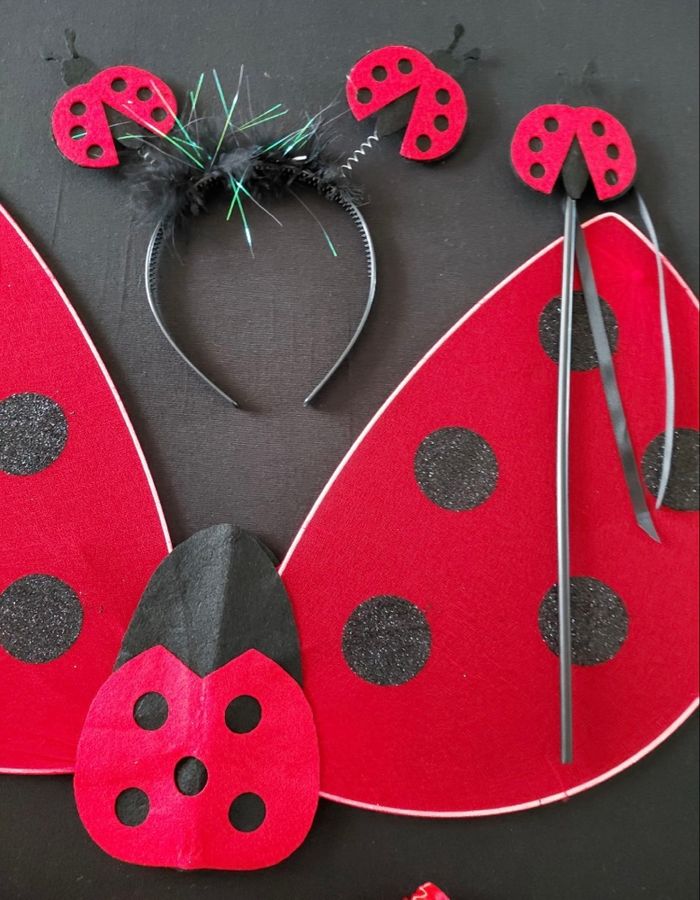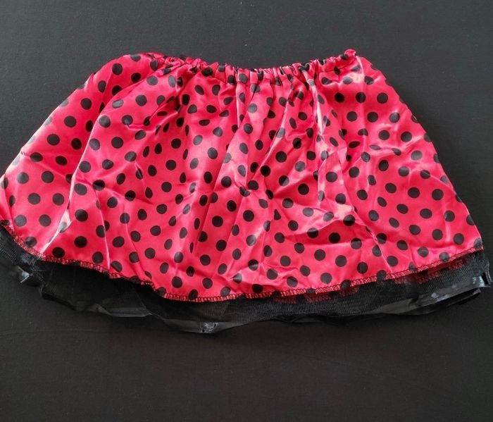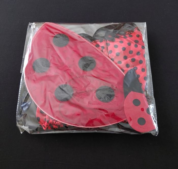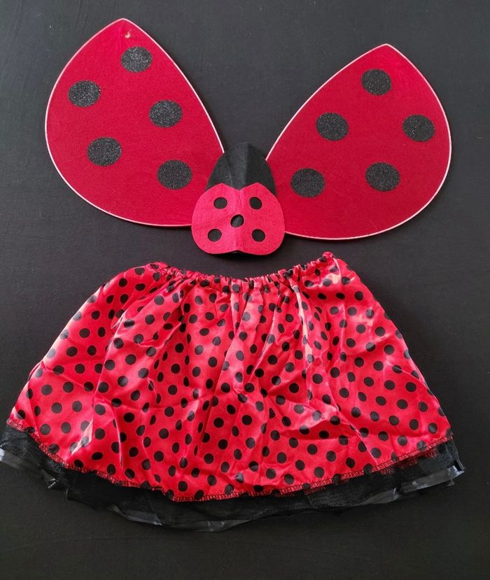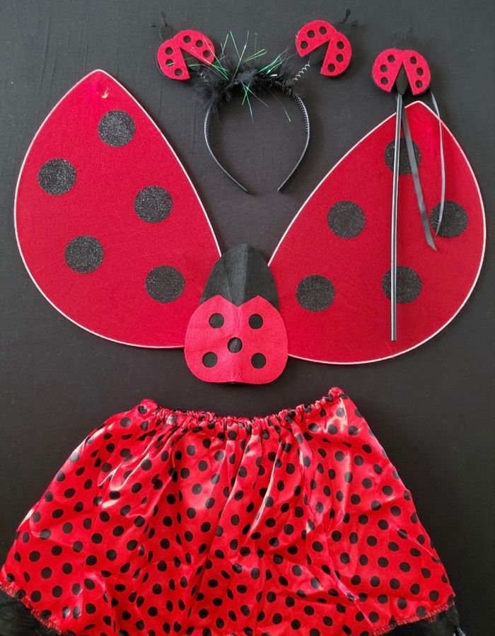 Déguisement coccinelle papillon composé d’une jupe élastique, d’un serre tête, d’une baguette et des ailes (élastique à enfiler). Convient aux petites filles de 4-6ans. Vendu neuf dans son emballage d’origine. Envoi rapide