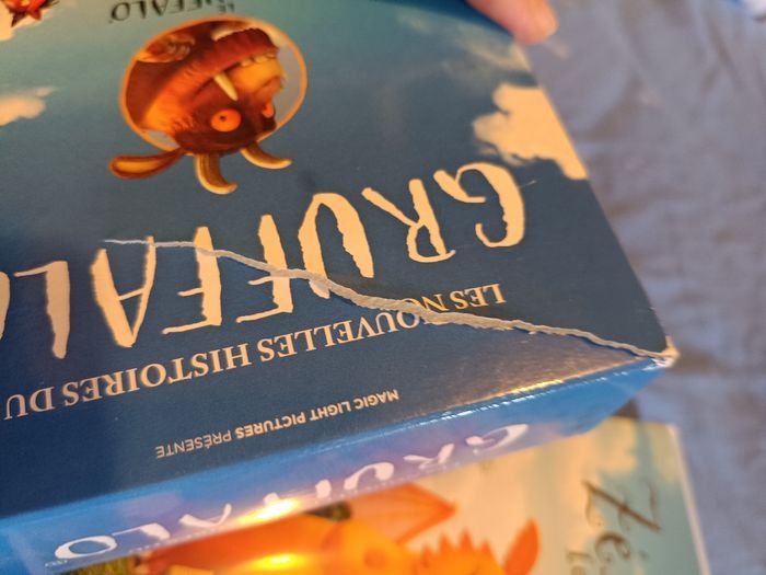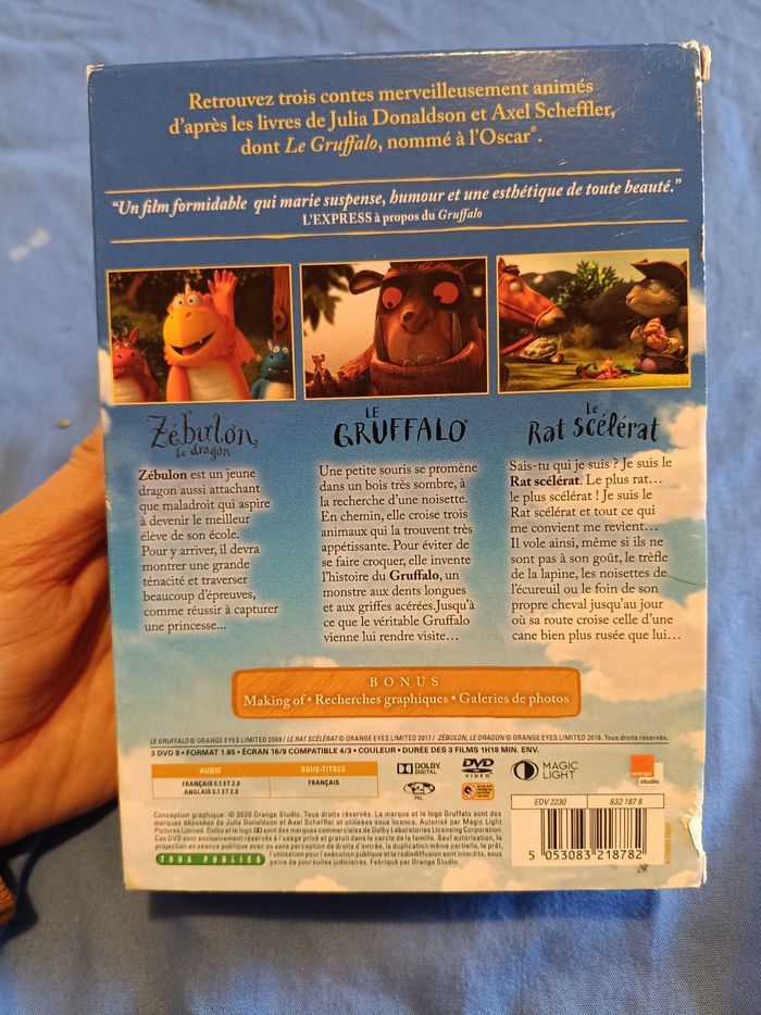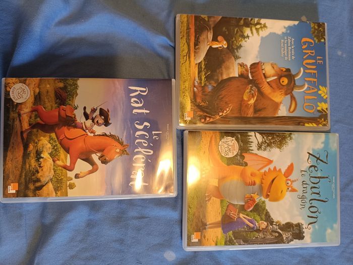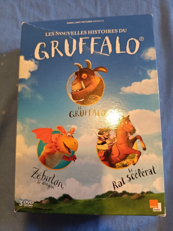 Coffret 3 DVD comprenant : Le Gruffalo, Zébulon le dragon, Le Rat scélérat. 📀 Disques en excellent état 📦 Boîtier légèrement abîmé (voir photo) Parfait pour enfants et collectionneurs!