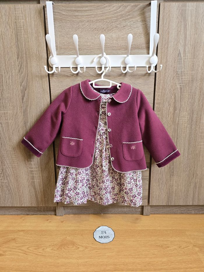Lien direct vers les tailles équivalentes dans mon dressing : #fdhsarah24mois #fdhsarahSGMJ 📜 Ensemble comprenant : - Gilet en polaire agrémenté de deux poches avant ornées de broderies fleuries parme et vert olive. Boutons imprimés fleuri Ref : LAJUNE - Robe manches longue amples avec plissage. Imprimé fleuri violet fonce, parme et vert sur fond écru. Détails en dentelle sur buste avec plissage. Ref : LAJANE Collection : Chouquette à Paris Taille 📏 : 24 mois 86 cm État 🔍 : Très bon état Marque 🏷️ : Sergent Major Je suis disponible pour toutes questions ou photos supplémentaires. 📦 L’envoi se fait le plus rapidement possible Bon Shopping #fdhxxx24xxx