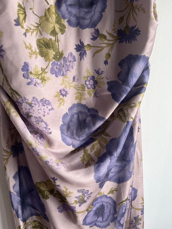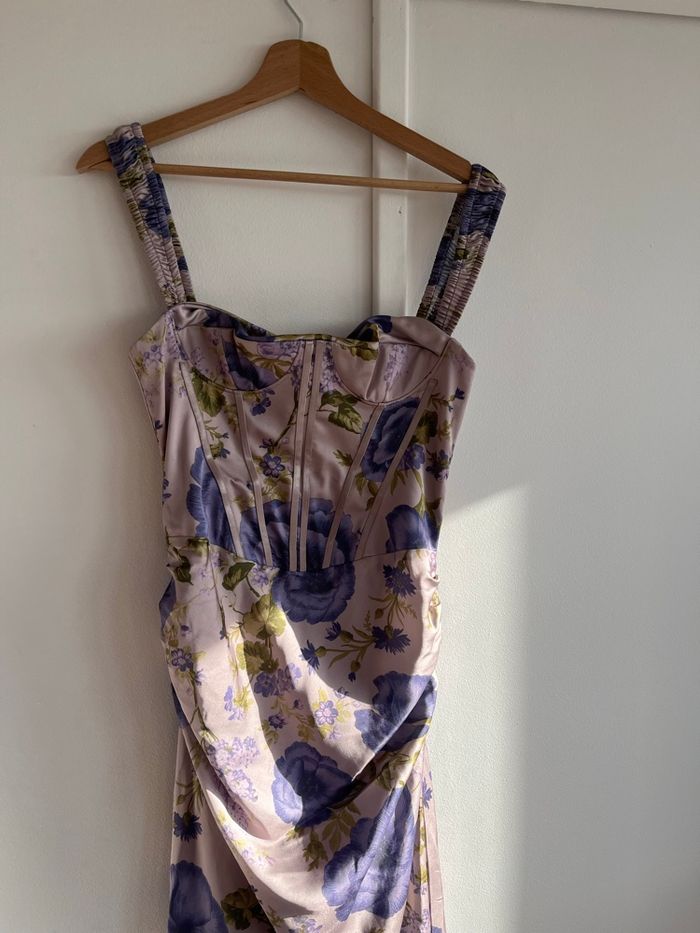 Robe avec un esprit corset à lacet derrière portée une fois pour un mariage silhouette sublime Se ferme sur le côté avec une fermeture invisible Idéal événements , robe demoiselle d’honneur, robe cocktail, robe soirée etc…. Imprimé fleurs mauve/lilas/violet Esprit romantique, empire, bridgerton…. Asos taille 36 taille correctement Prix d’achat 90 euros