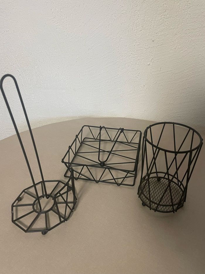 Lot de 3 accessoires cuisine en métal noir comprenant un porte essuie tout, un porte serviette en papier et un pot pour ustensiles. Très bon état.