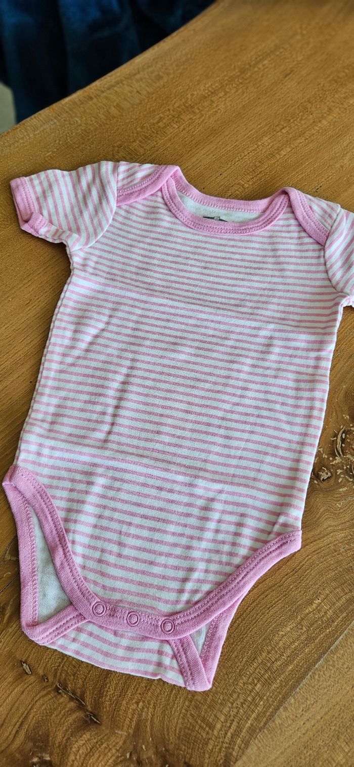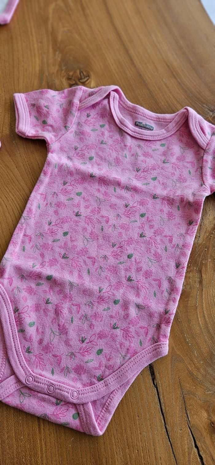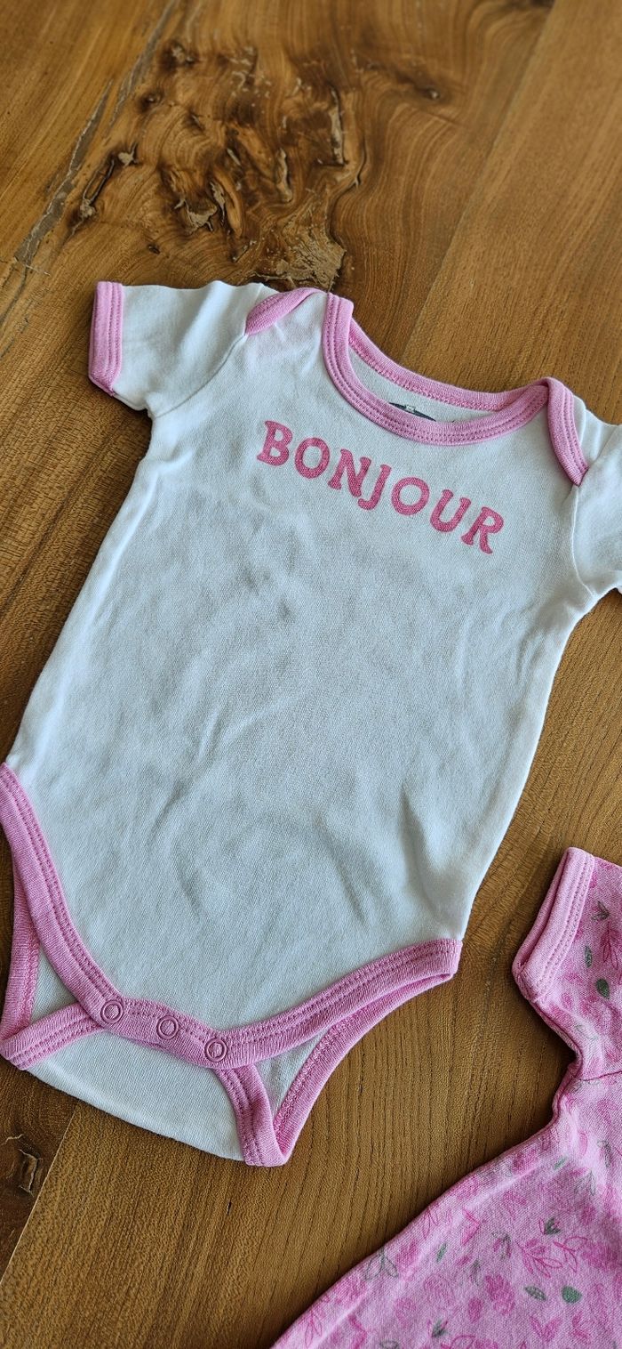 Lot de 3 bodies manches courtes bébé fille blancs et roses. Ouverture pressionnée à l'entrejambe. Jamais porté donc neufs. Aucune tâche, ni trou 👌