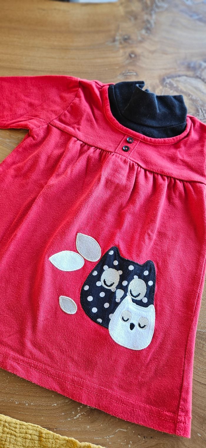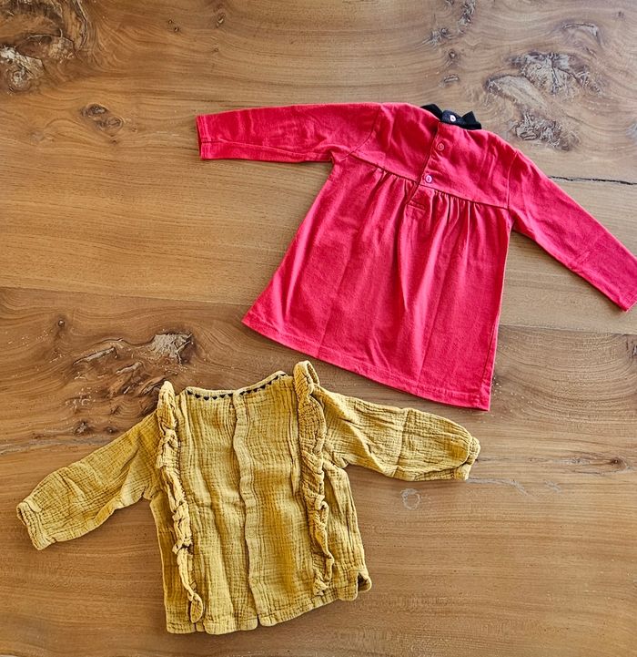 Tee shirt manches longues rouge et noir bébé fille. Dessin de hibou brodé sur le devant. Porté mais reste en très bon état. Aucune tâche, ni trou 👌 Blouse bébé fille de couleur moutarde. Élastique aux poignets. Ouverture pressionnée dans le dos. Porté mais reste en bon état. Aucune tâche, ni trou 👌