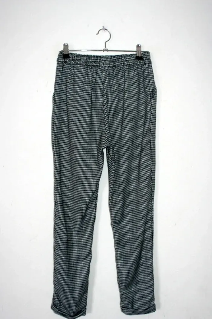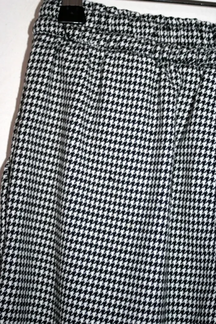 Pantalon pied de poule de chez H&M, taille 14 ans +, taille élastique, quelques fils tirés à l'arrière cf photo, 90cm de long, 67% polyester / 31% viscose / 2% élasthanne, 340g