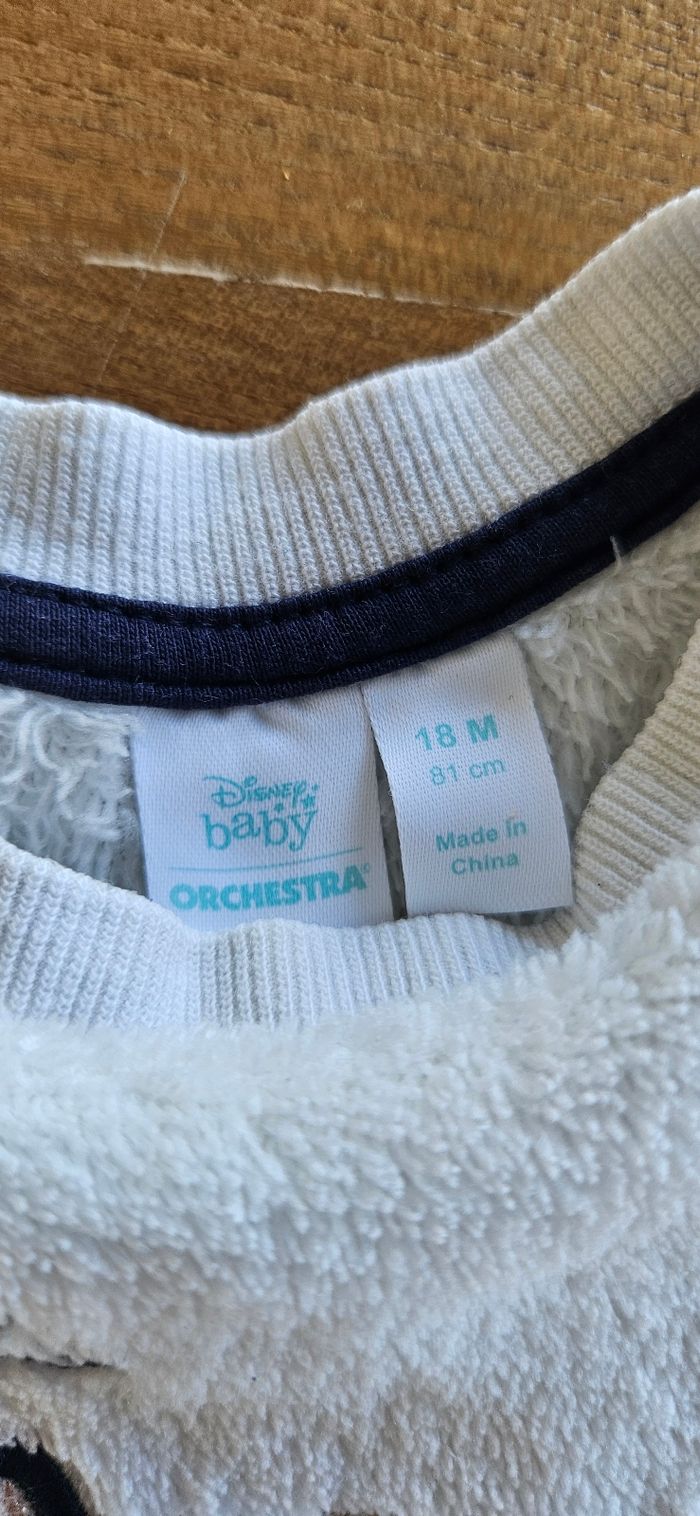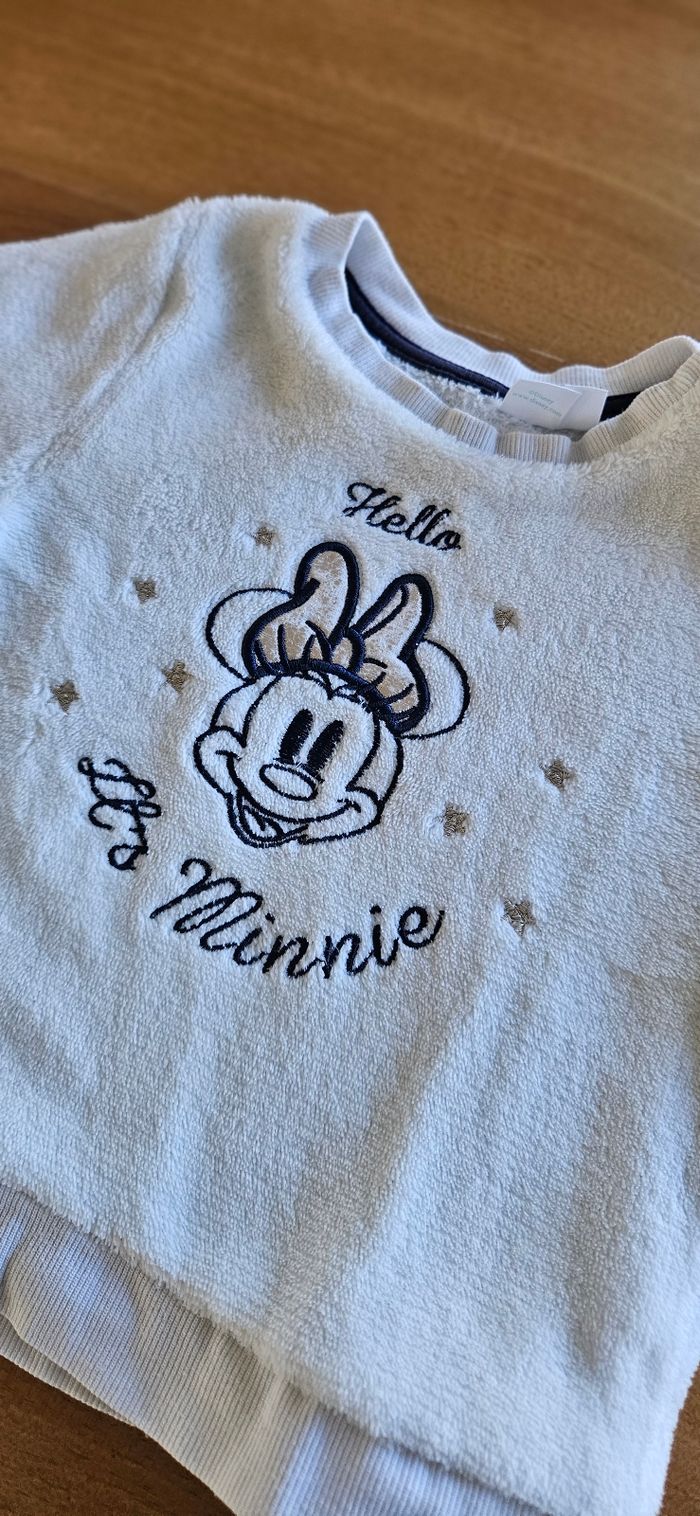 Pull chaud bébé fille. Dessin Minnie brodé sur le devant. Ouverture pressionnée sur l'épaule. Porté mais reste en bon état (couleur sur le nœud de Minnie qui commence à partir, voir photo). Aucune tâche, ni trou 👌