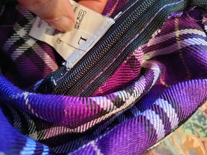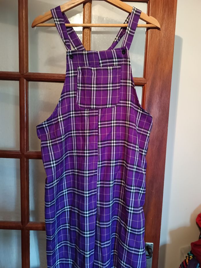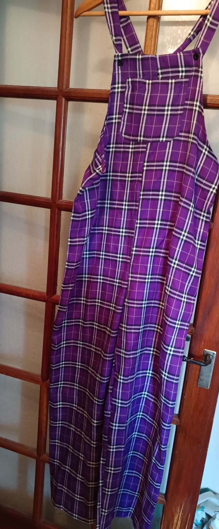 Salopette neuve achetée chez rétro stage . Bretelles réglables L. Violette à carreaux . Je suis trop petite ( 1m60). Ça me tasse trop.