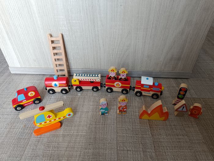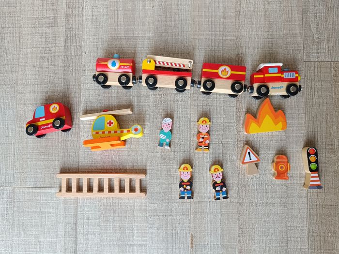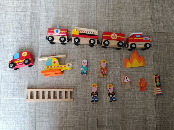 Je vends un lot de Train de pompier + accessoires janod Bois Très bon état