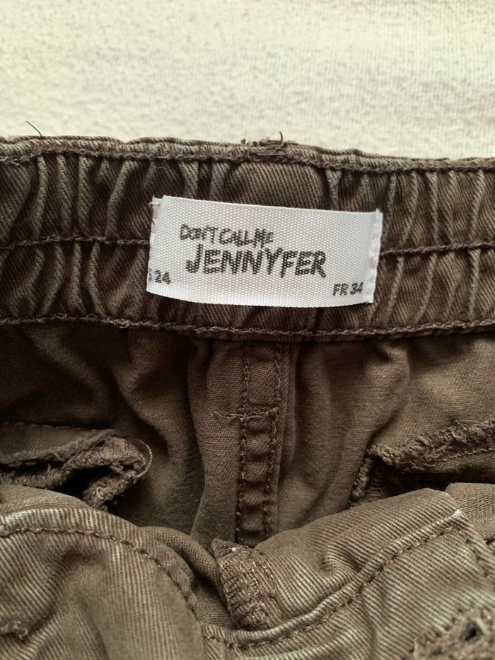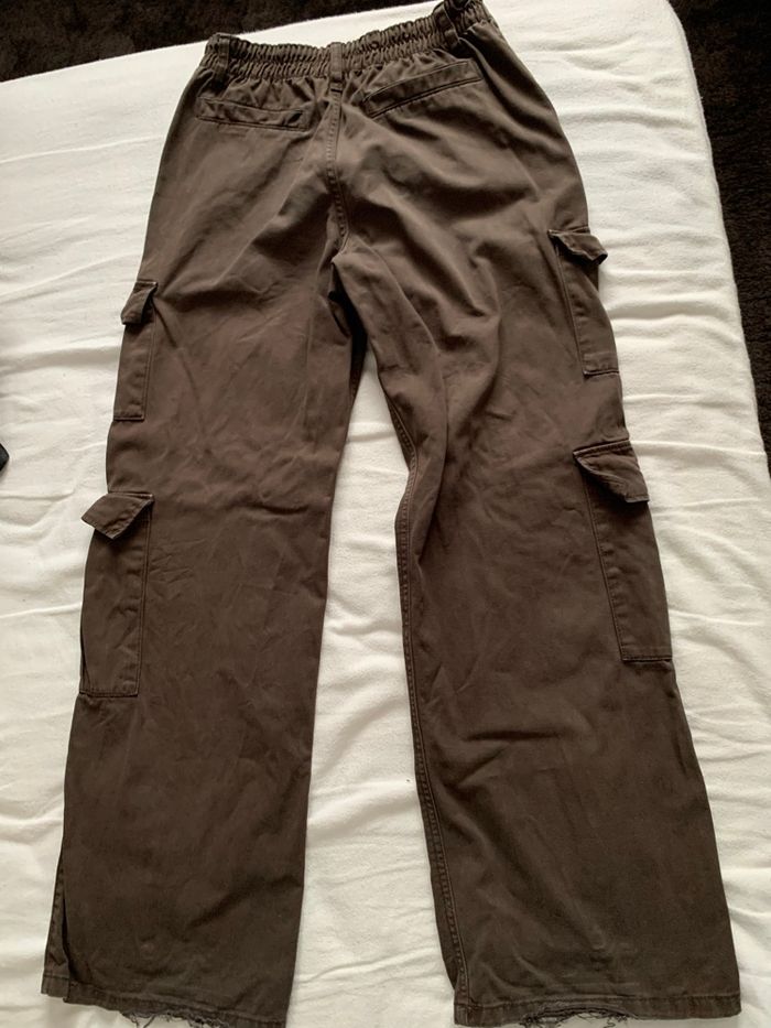 Pantalon cargo marron avec 2 poches sur le coté de chaque jambes, 2 poches à l'avant, 2 fausses poches à l'arrière, coupe large dans le bas des jambes et taille élastique, taille 34 de chez Jennyfer, petit défaut : l'arrière de l'ourlet est usé (voir dernière photo)