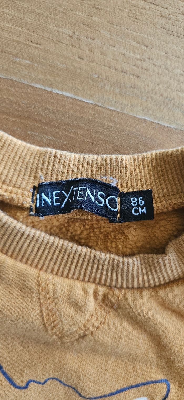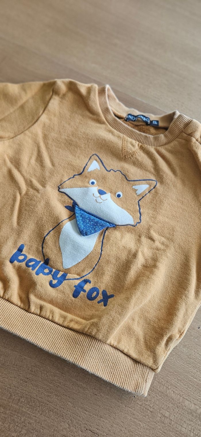 Pull chaud marron, garçon. Dessin imprimé sur le devant. Ouverture pressionnée sur l'épaule. Porté mais reste en très bon état. Aucune tâche, ni trou 👌