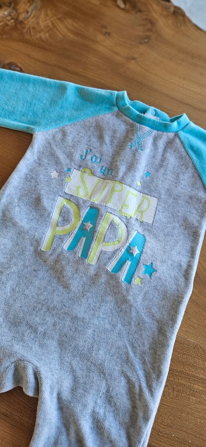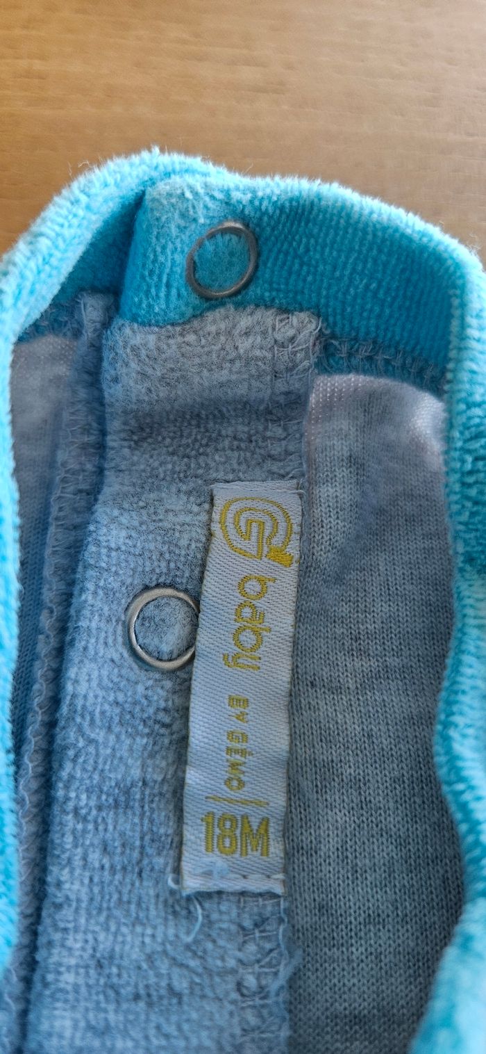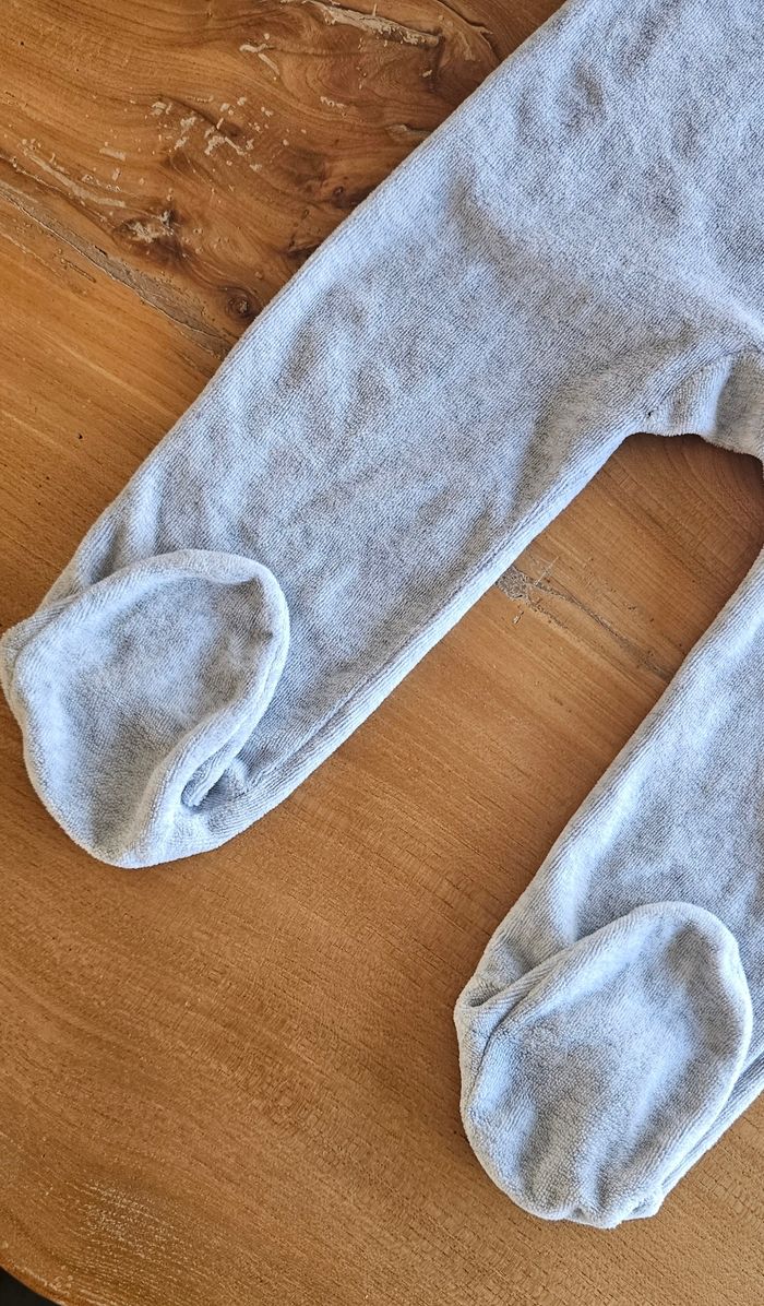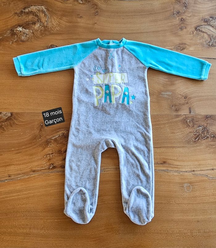 Pyjama chaud gris et bleu, bébé garçon. Écriture imprimée sur le devant. Ouverture pressionnée dans le dos. Porté mais reste en très bon état. Aucune tâche, ni trou 👌