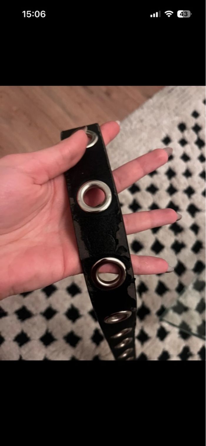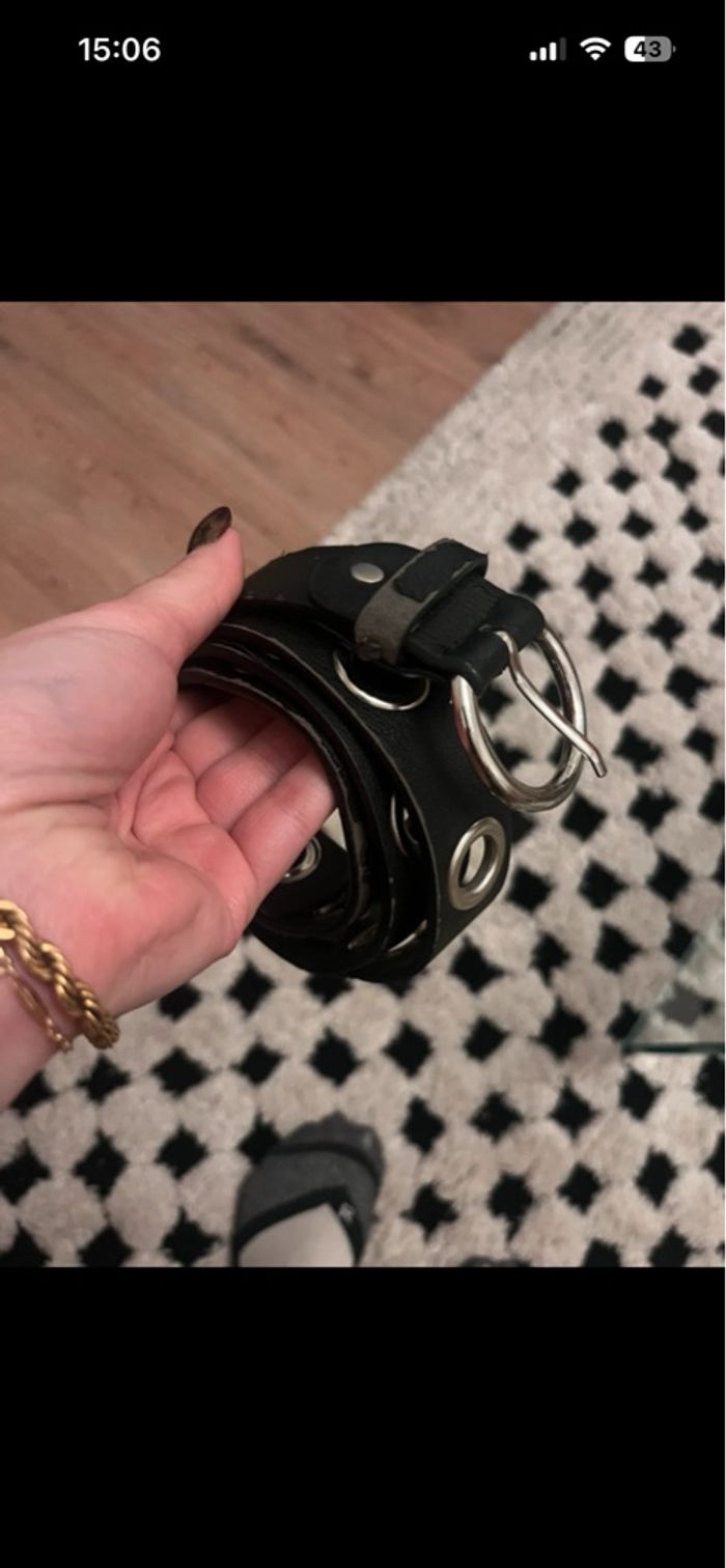 ceinture noire à œillet avec des marques d’usure, voir photo
