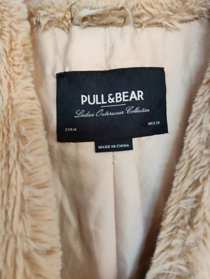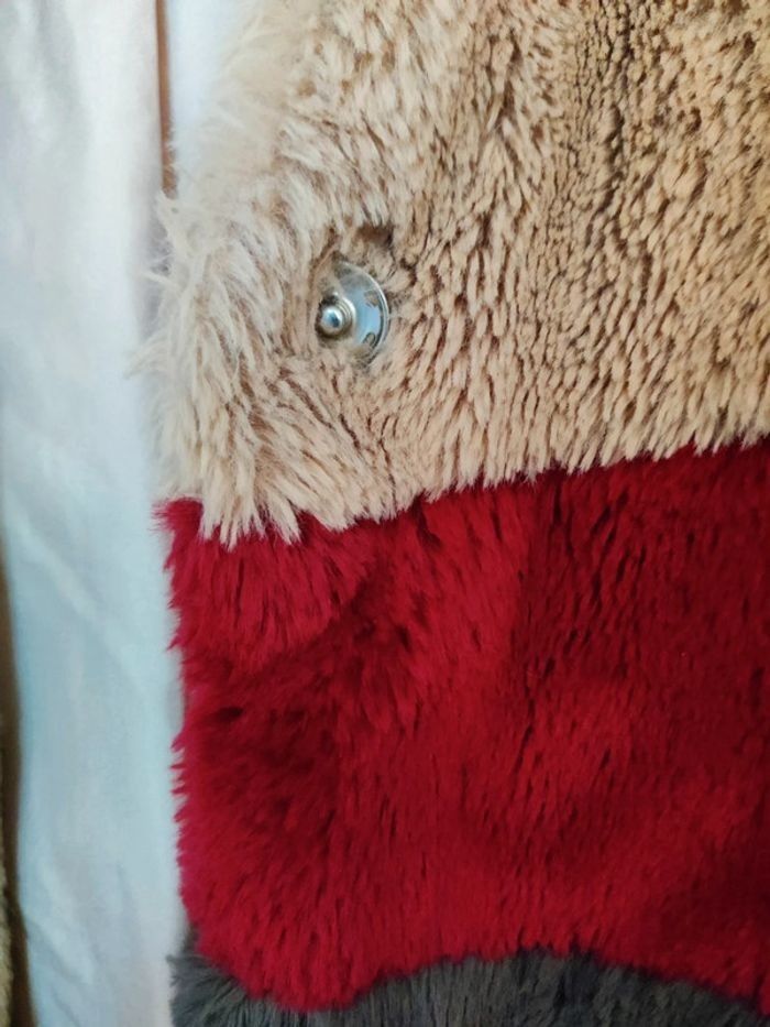 Manteau fausse fourrure beige, bande bordeaux et gris anthracite Fermeture par boutons pression 2 poches Pull&Bear Taille M