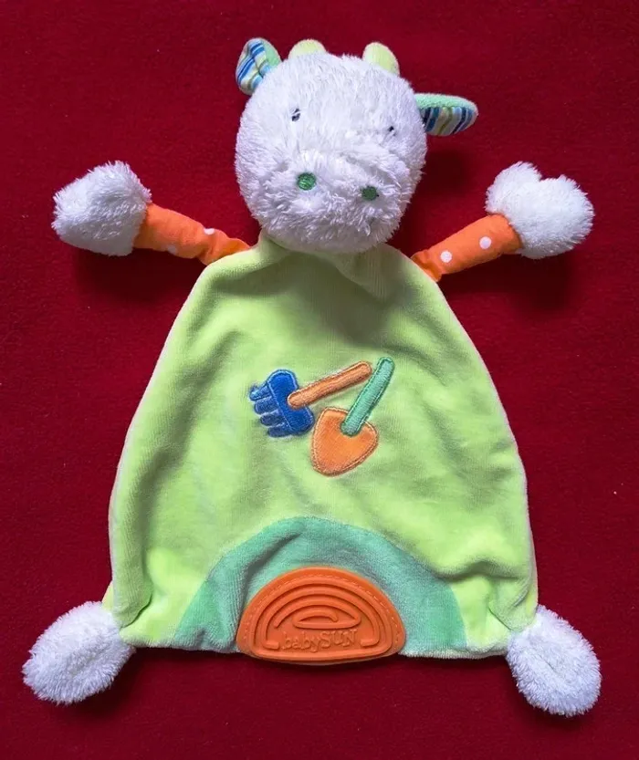 DOUDOU PLAT VACHE EN VELOURS VERT 2 TONS SUR LE DOUDOU SONT BRODES 1PELLE ET 1 RATEAU TETE DE VACHE SUR LE HAUT DU DOUDOU ANNEAU DENTITION SUR LE BAS DU DOUDOU ETAT PARFAIT !