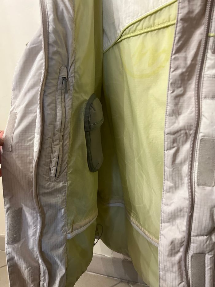 Blouson qui correspond à un grand M , petit L. De nombreuses poches et bien chaud. Aucun trou , aucune tache. À servi 3 saisons mais peut encore bien servir. Bien chaud. Il est blanc , gris clair et verre d eau. Je n ai plus la moumoute qui va sur la capuche