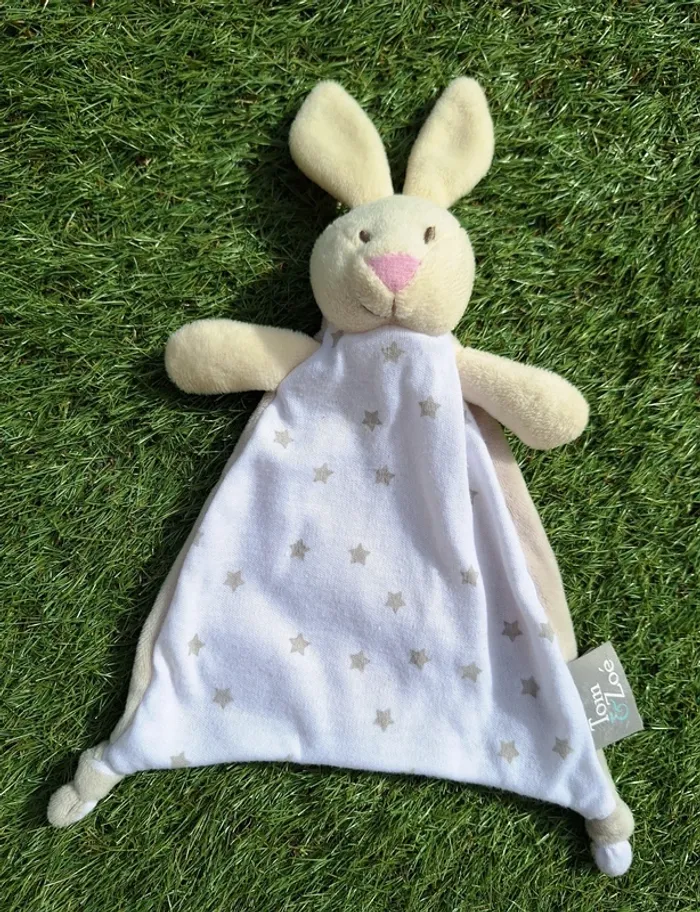 DOUDOU PLAT LAPIN BLANC ET BEIGE ETOILES SUR LE DEVANT ETIQUETTE TOM & ZOE SUR LE COTE ETAT PARFAIT !