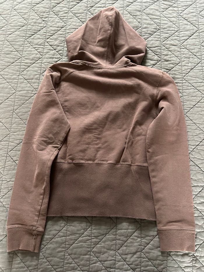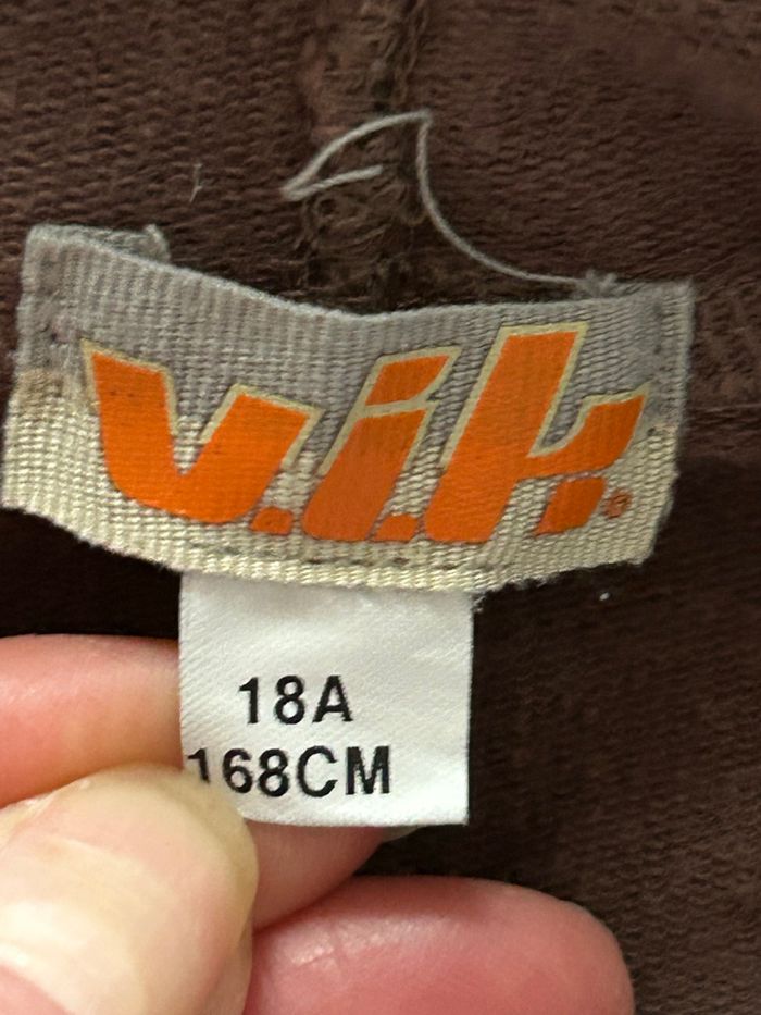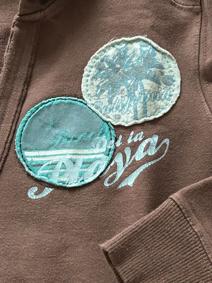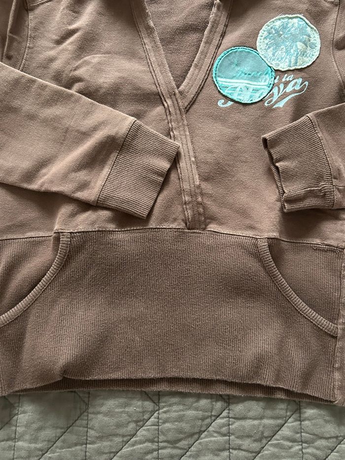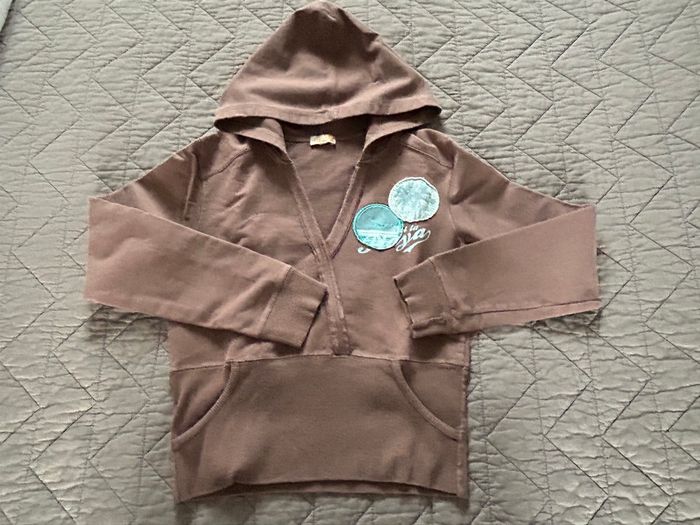 sweat à capuche original de la marque « v.i.k »(Vertbaudet) fille. Taille 18 ans/ 168 cm. Couleur marron avec écussons turquoises brodés sur la poitrine gauche. Forme originale, courte, col en V avec capuche et poche kangourou dans la ceinture côtelé. En très bon état.