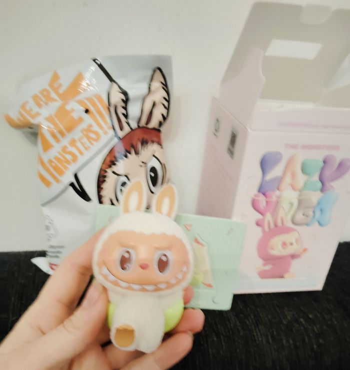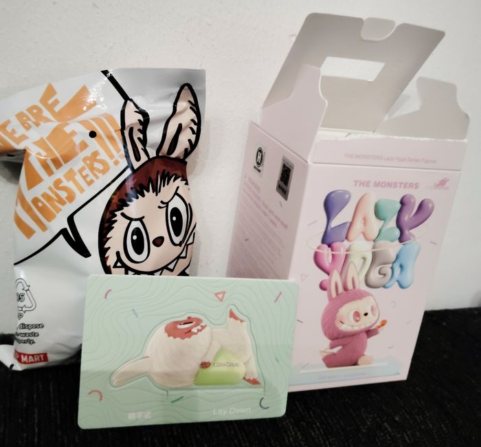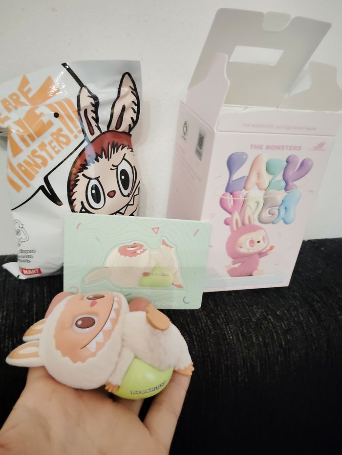 Figurine the Monsters de chez popmart labubu lazy yoga lay down gros ballon ball . Je l ai en double, je n ai donc pas ouvert le sachet et pris le mien en photo pour vous montrer le modèle. Donc neuf. #laydown #popmart #themonsters #lazyyoga #labubu #ball #fitness #yoga #collection #boite
