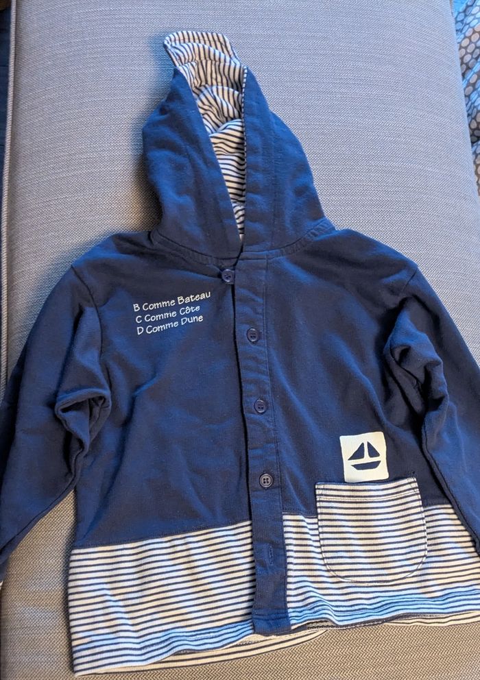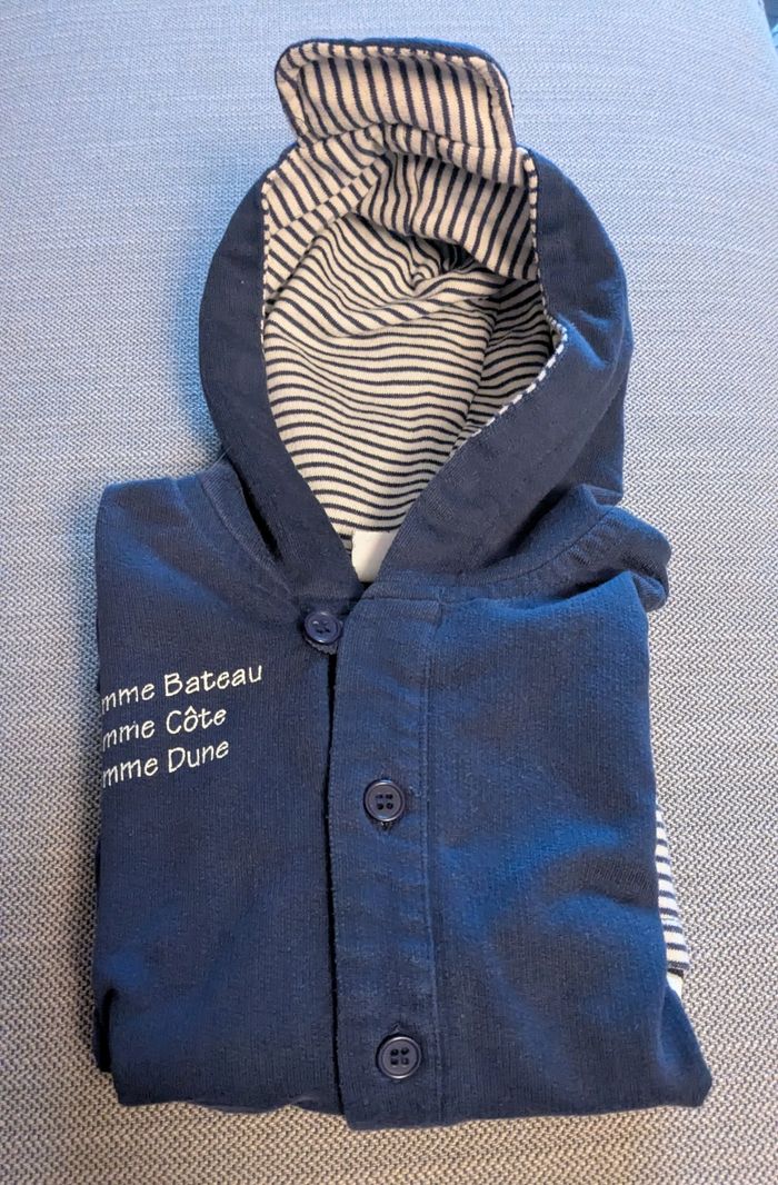 Veste manches longues avec capuche de couleur bleu marine et rayures bleues et blanches sur le thème marin. Petite poche sur le devant en bas à gauche Ferme par des boutons sur le devant. Très bon état, matière 60%coton et 40%polyester Envoi rapide
