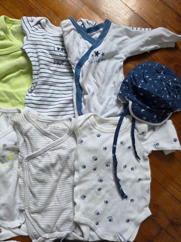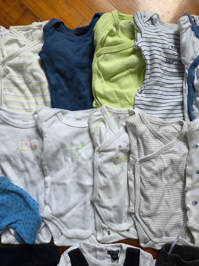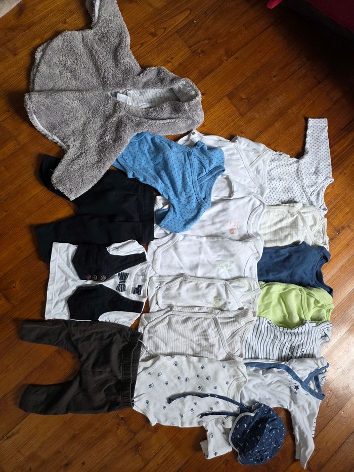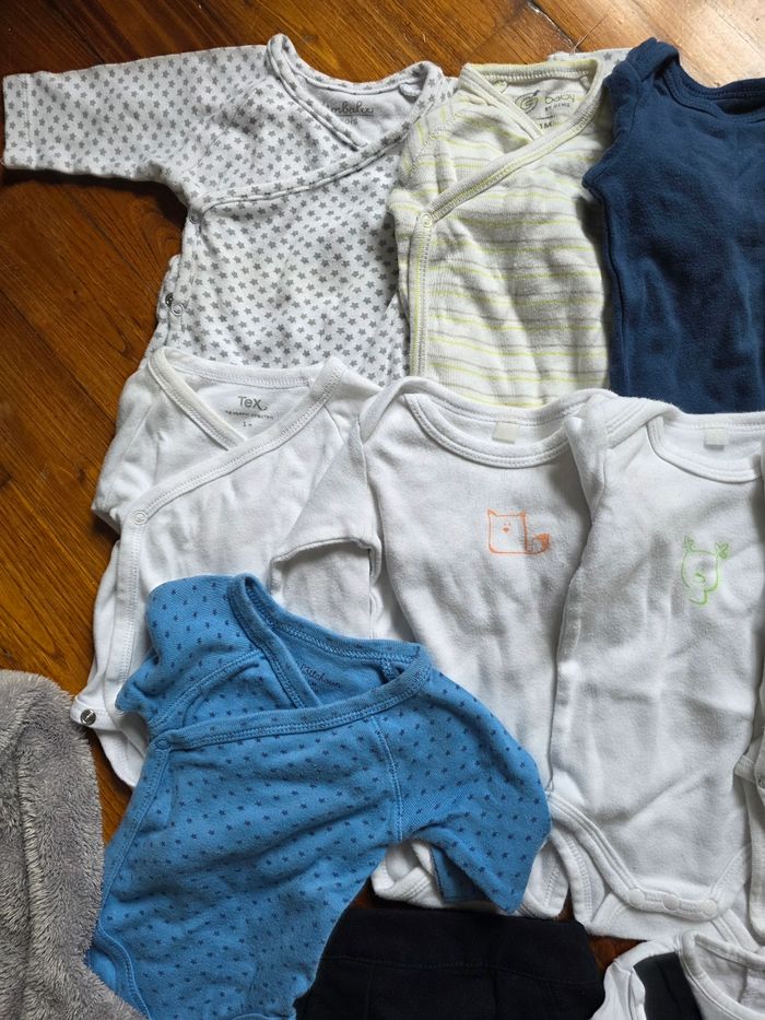 Contient : 13 Bodys ML 2 Pantalons 1 T Shirt Manches longues 1 cape d'hiver Différentes marques : Gemo , Kiabi ... Ne pas hésiter pour plus de photos