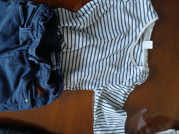 Ensemble short kaki et tee-shirt moutarde Sucre D'Orge, combishort rayé bleu Terre de Marins, 1 combishort Corsica, 1 bermuda gris, 1 tee-shirt rouge Extenso 1 short bleu marine Week-end à la Mer 1 ensemble pantalon léger kaki et tee-shirt manches longues Gémo 1 tee-shirt manches longues rayé et 1 pantalon bleu marine Gémo
