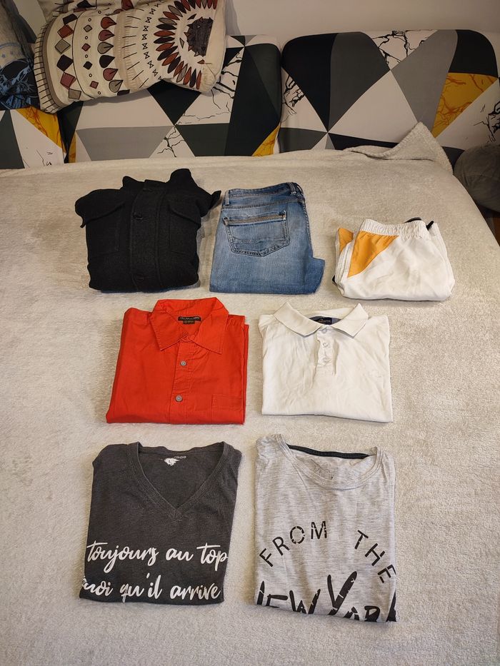 Je vends ce lot de vêtements homme en très bon état. Le lot contient 7 articles: - 1 blouson chaud taille L - 1 jean taille 42 - 1 chemise manches courtes taille L - 1 short Speedo taille S - 1 polo taille L - 1 tee shirt taille L - 1 tee shirt taille M 12€ le lot Envoi rapide 📦
