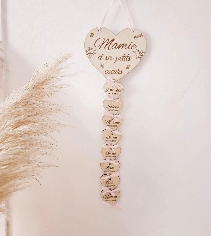 Suspension murale « Mamie et ses petits Cœurs» Taille du grand coeur : Env 15cm de haut Tailles des petits : env 4cm de haut Possibilité de personnaliser le grand cœur ( Gravures fleurs ou autres, fleurs artificielles..) Modifirr le texte etc.. Couleur des rubans au choix. Tarif : 20,00€ avec trois cœurs + 1€ par petit cœur en plus. Possibilité de faire encore plus grand ( le tarif s’ajustera suivant la taille )