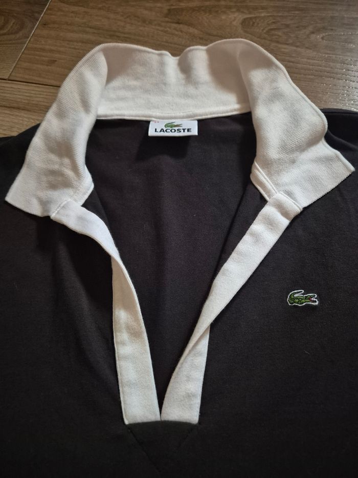 Tshirt de la marque Lacoste taille XL voir meme au L. Noir avec col blanc, logo a l avant. Manque un peu d éclat mais reste noir.