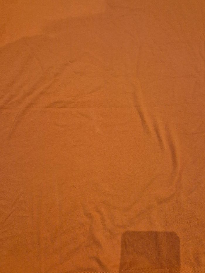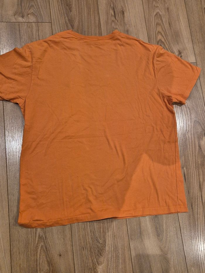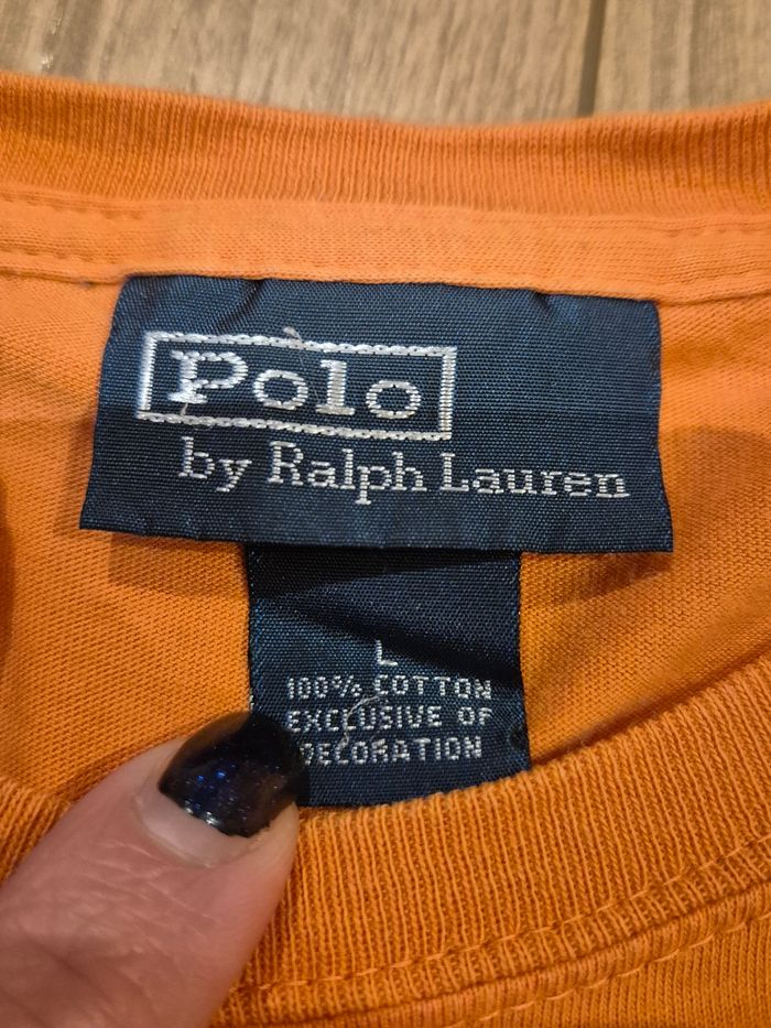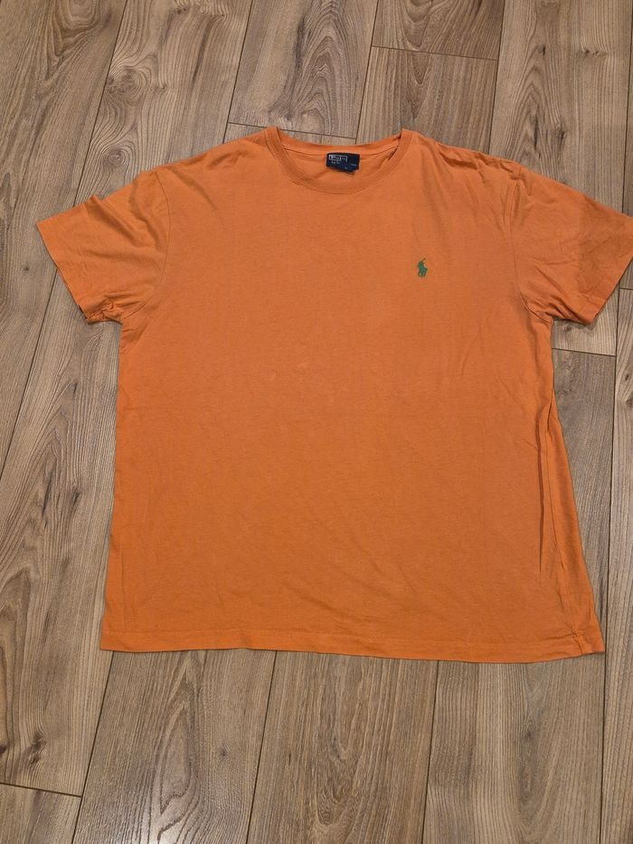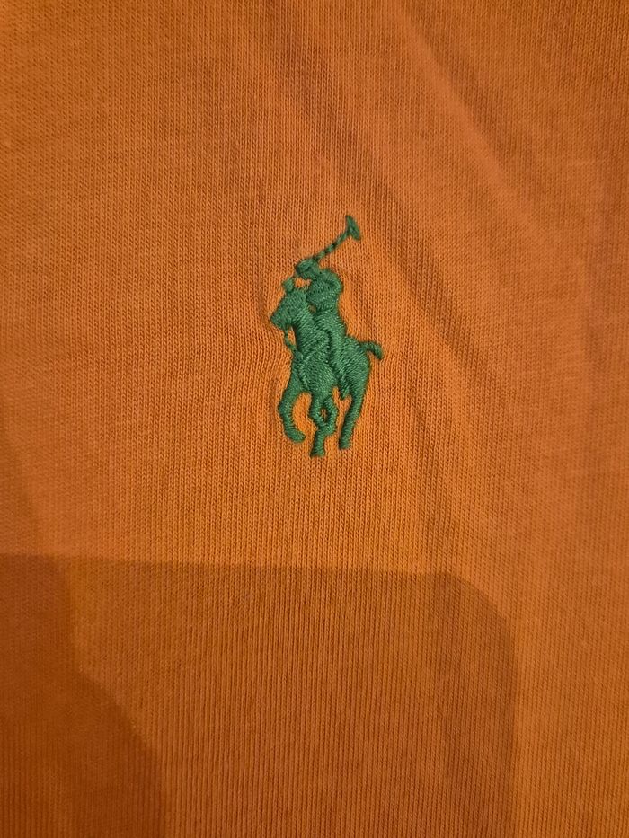 Tshirt de la marque Ralph Lauren en taille L. Orange avec logo vert a l avant. Semble avoir une pigmentation moins orange au niveau du bas du dos voir photo.