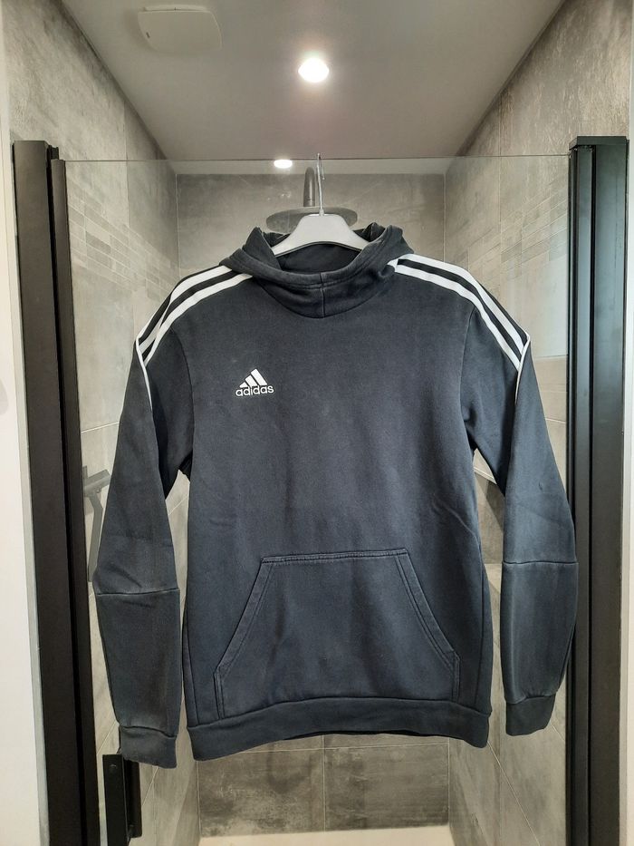 Sweat à capuche Adidas noir avec bandes blanches iconiques sur les manches. Coupe regular – Taille M (homme/unisexe, mesures sur demande). 🌟 Détail : logo Adidas brodé sur la poitrine, capuche avec cordon, bandes blanches signature sur les manches 🧶 Matière : coton majoritaire, intérieur doux et confortable ✅ État : très bon (aucun défaut, bien entretenu) 📦 Envoi rapide sous 48h dans un emballage propre et recyclable ❓ Une question ? Envoie-moi un message, je te réponds rapidement !