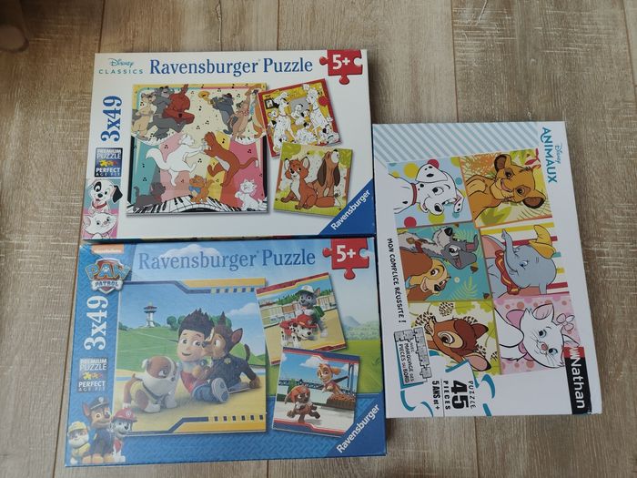 Lot 3 boîtes puzzle complets dont une boîte avec 3 modèles de puzzles Disney différents , une autre avec 3 Pat patrouille différents et une dernière boîte animaux disney. A partir de 5 ans