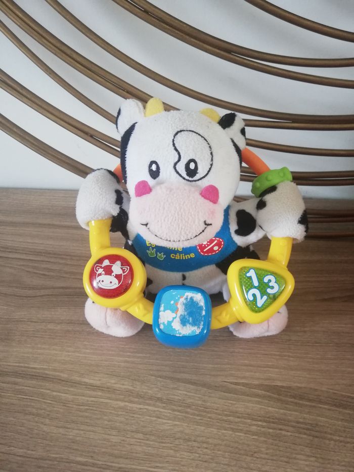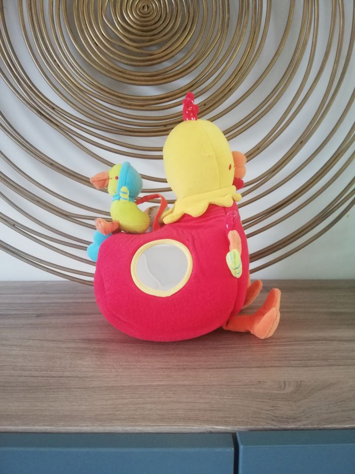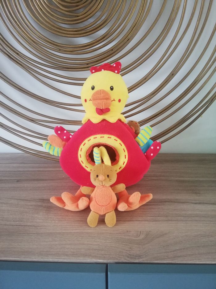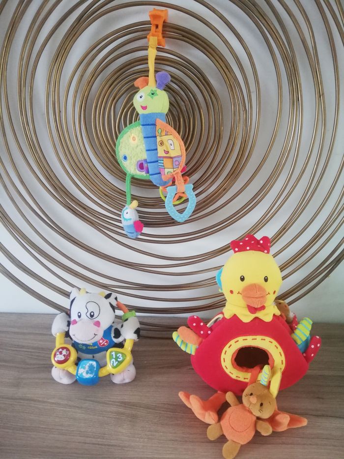 Je vends ce lot de 3 jouets pour bébé. Ce lot se compose de: - 1 Poule d'activités en très bon état - 1 jouet Babysun à accrocher partout (voiture, poussette etc...) en très bon état - 1 vache d'activité en état satisfaisant, il manque un autocollant et il y a quelques tâches. #jouet #jouet1erage #jouetaaccrocher #hochet1erage #joueteveil #jouet1erage #jeuactivitebebe #jouetpoule #jouetbebe #jouetpeluche